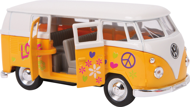 This model of the legendary "Bully", now in "hippie dress", is a true dream by VW! A nice collector‘s item and a great toy – because this car model has an automatic pull-back and moving double doors on one side! Pull back the car and then immediately release it to see how it drives good on its smooth-running wheels!