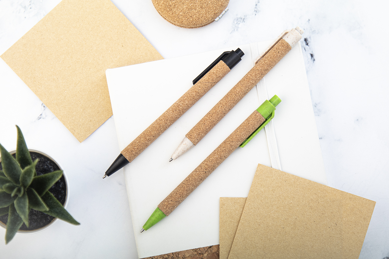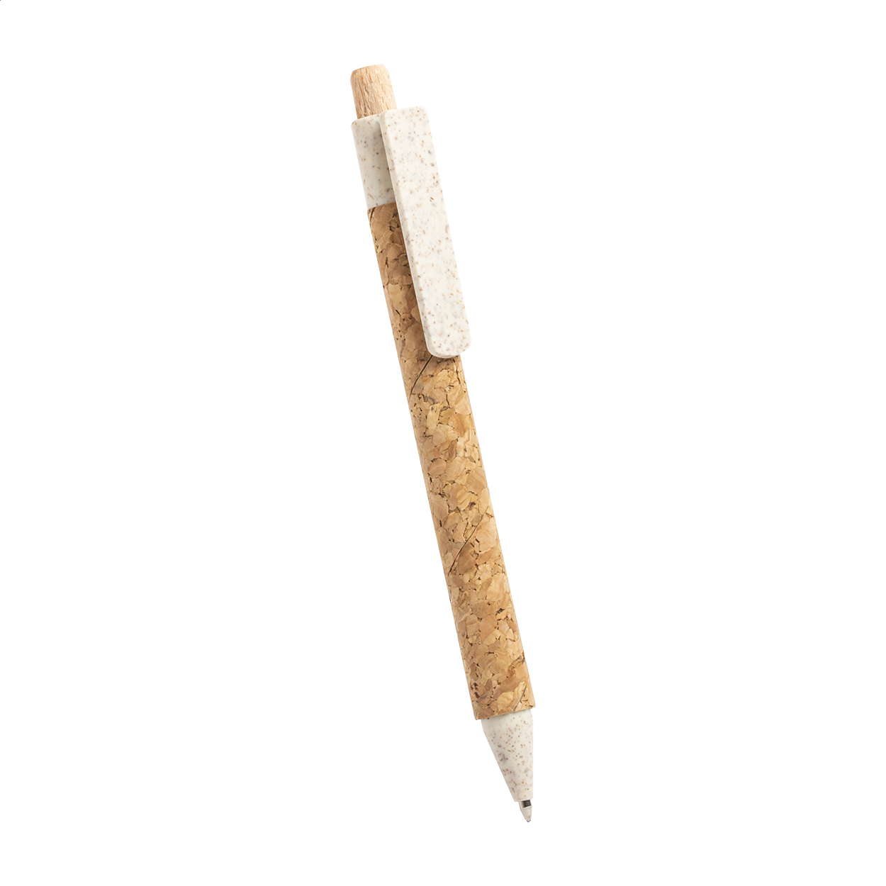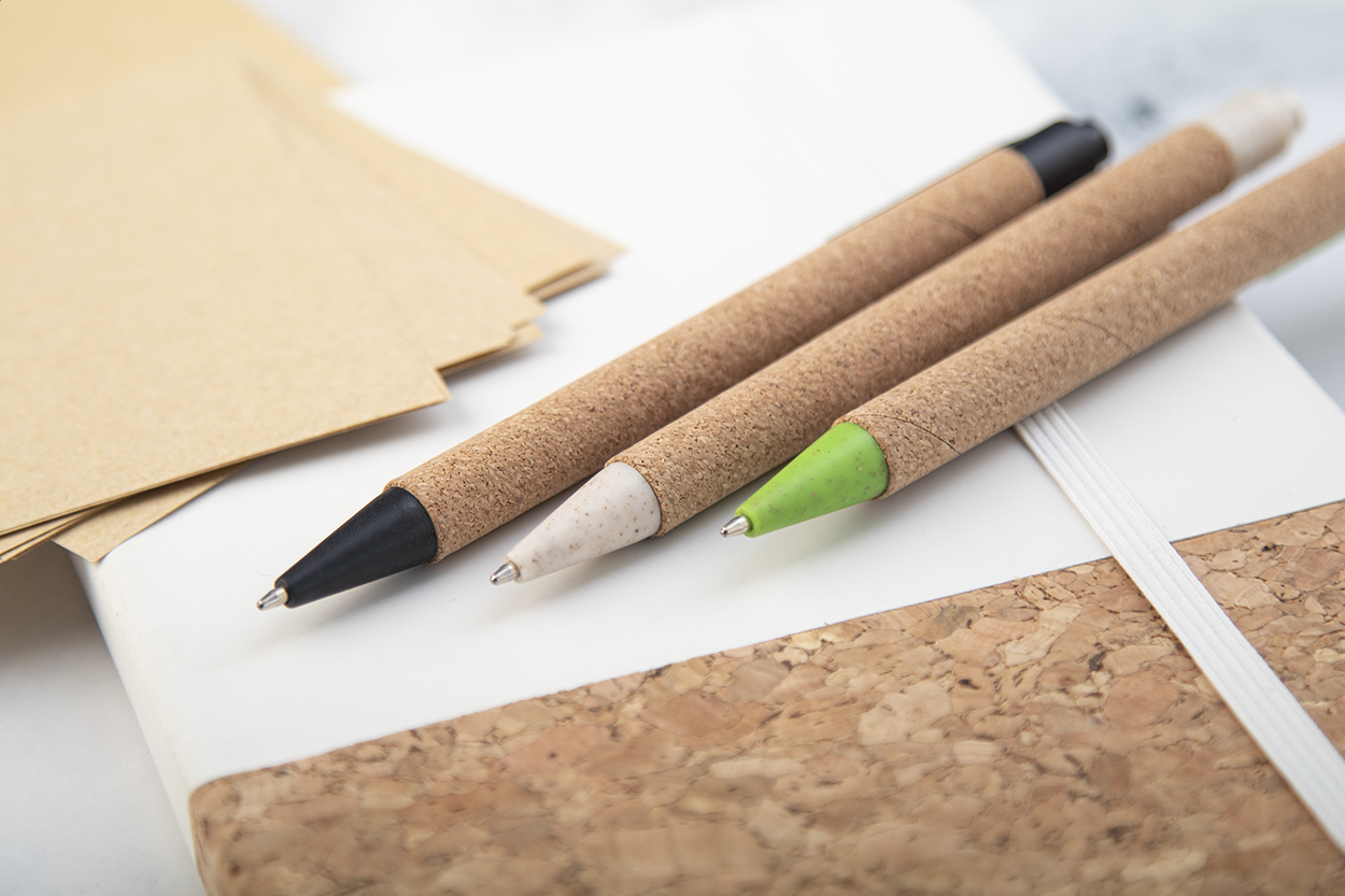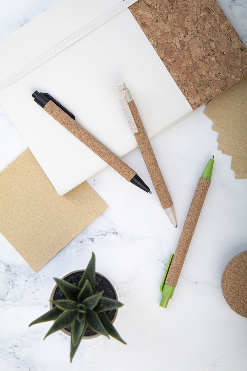 Ecological wheat straw plastic ballpoint pen with natural cork covered barrel. With blue refill.