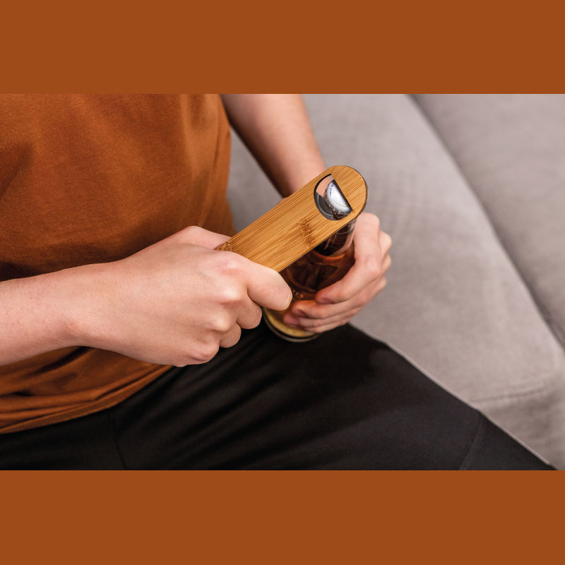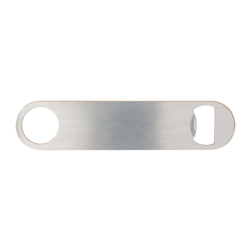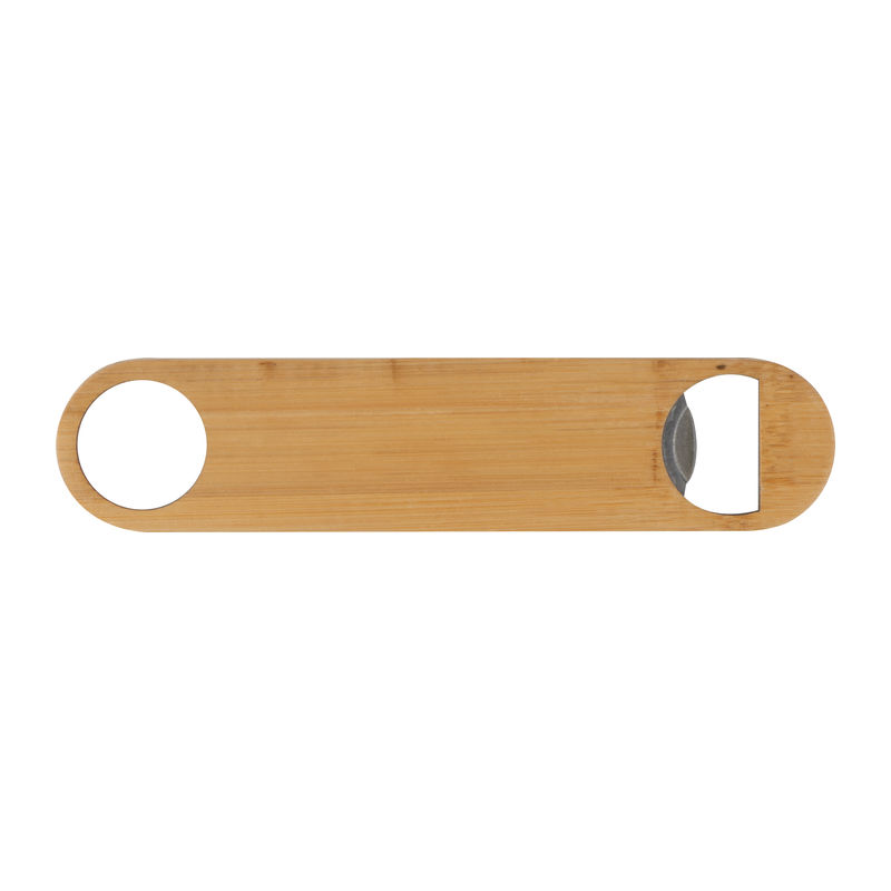 Large stainless steel bottle opener with one bamboo side on which your logo will be engraved.