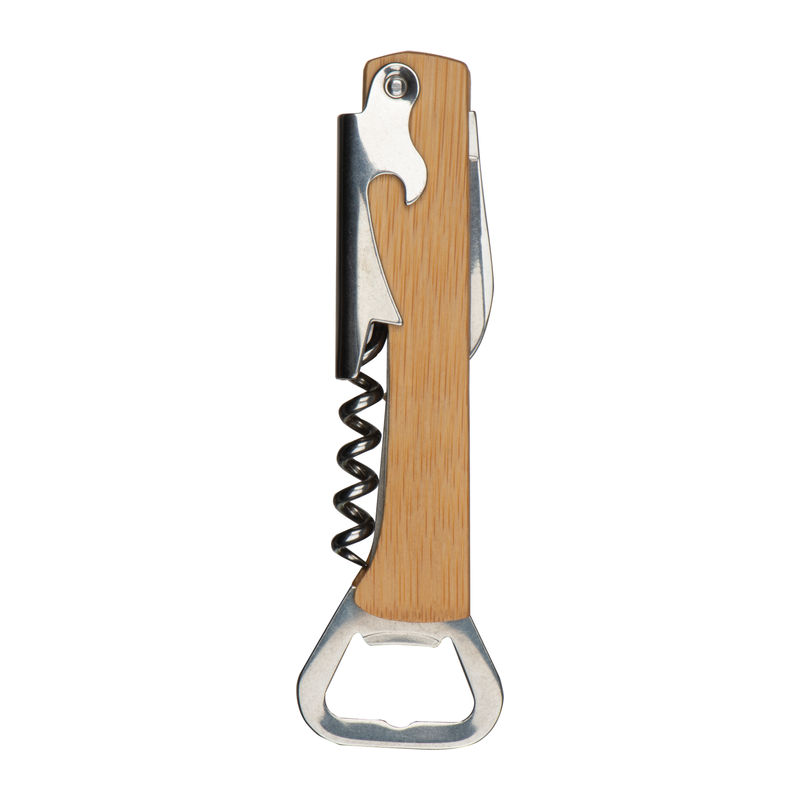 Metal and bamboo waiter's knife with bottle opener, corkscrew and foil cutter. Your logo will be engraved on the bamboo surface.