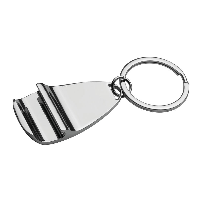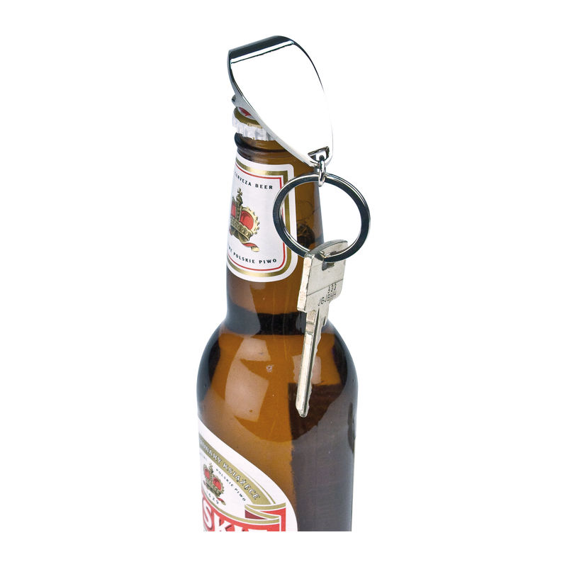 Multifunctional and conveniently portable, this elegant chromed metal bottle opener also serves as a stylish keychain. Each key ring is individually packaged in a cardboard box.