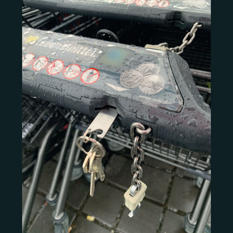 Stainless steel key ring featuring an integrated shopping cart token and bottle opener.
