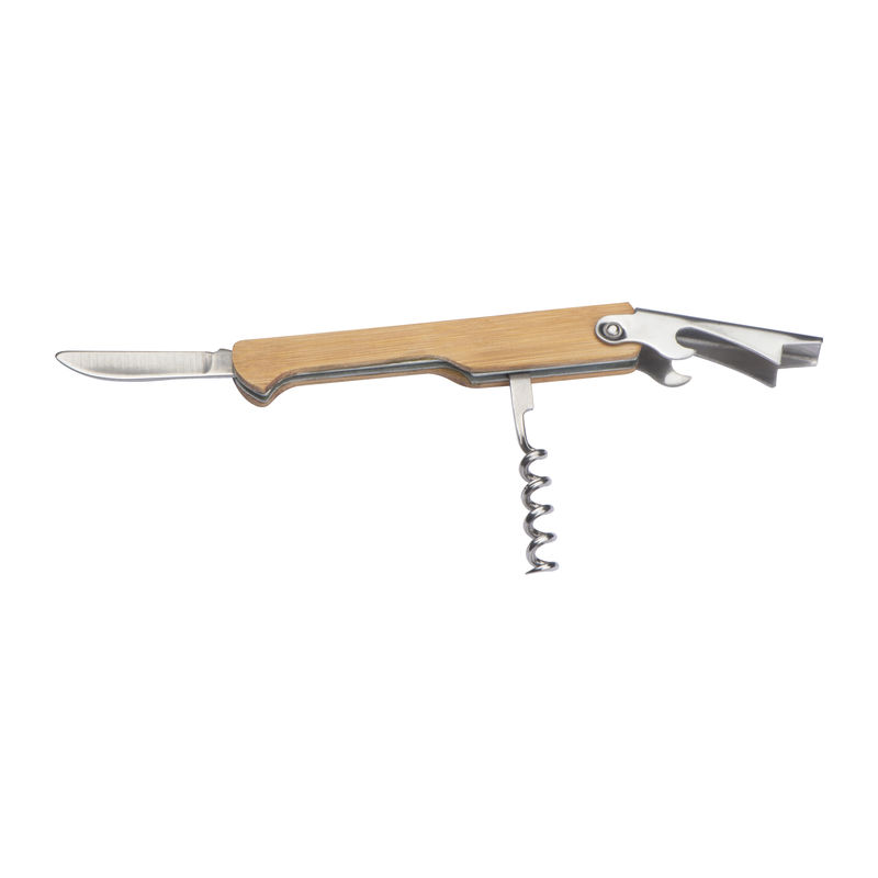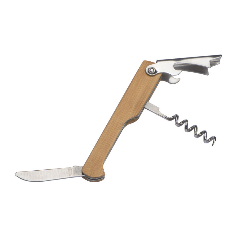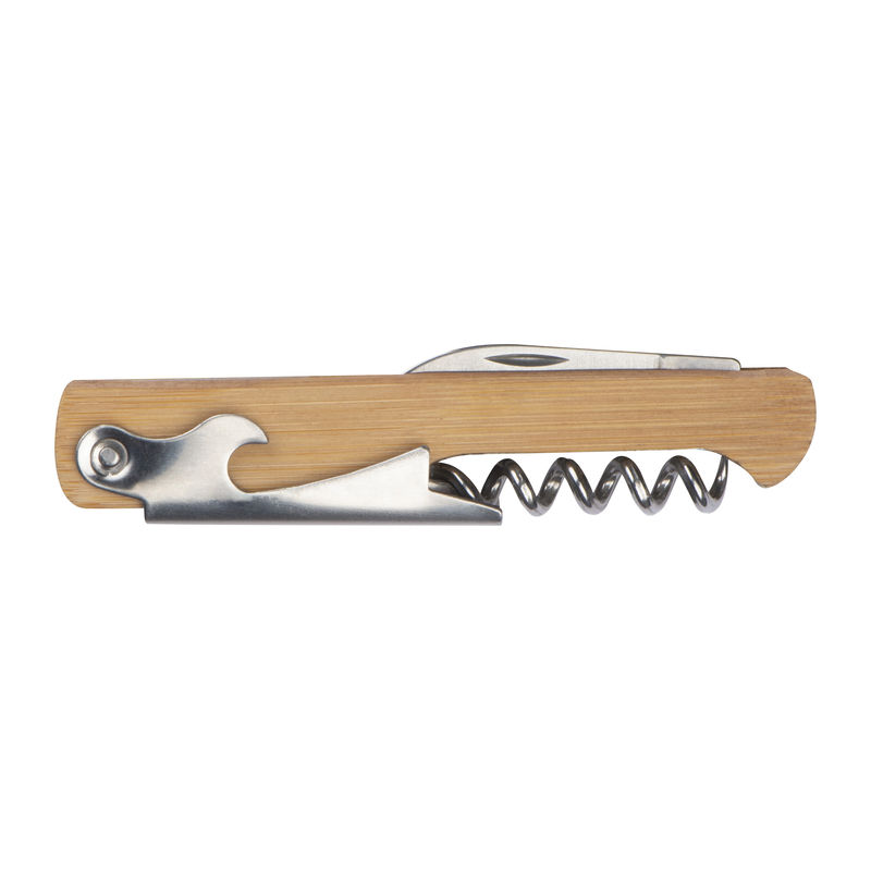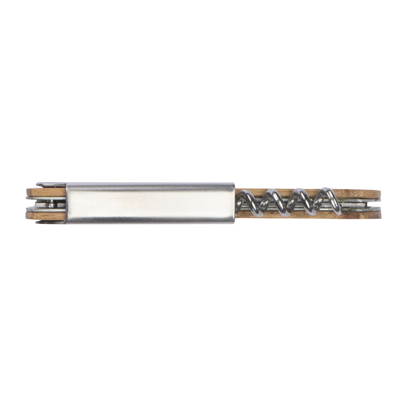 Metal waiter’s knife featuring a bamboo coating, equipped with a bottle opener, foil cutter, and corkscrew. Each unit and engraving is unique due to the natural bamboo material.