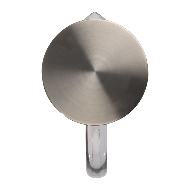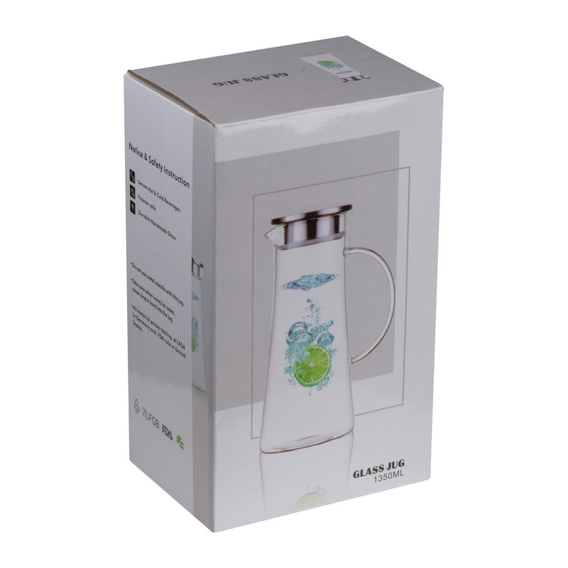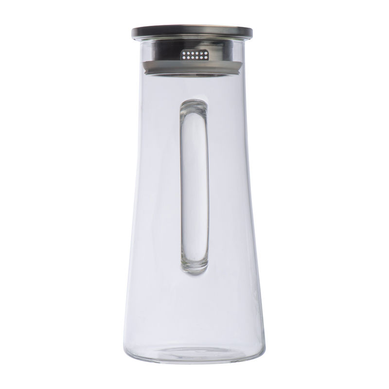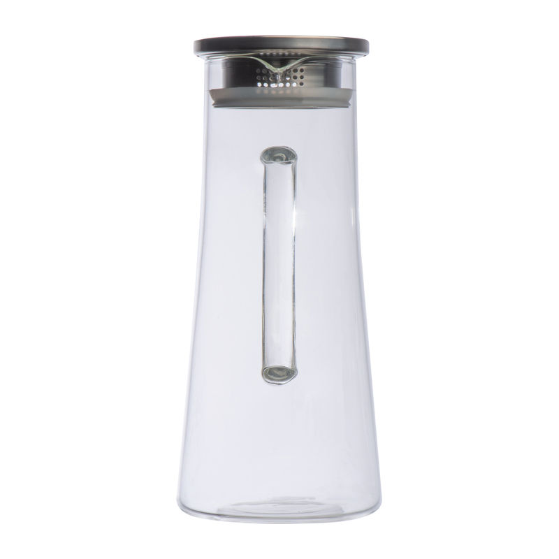 Glass carafe with stainless steel cap and 1350 ml capacity. The cap has 2 different openings: a sieve and a large opening. Your logo will be engraved on the lid.