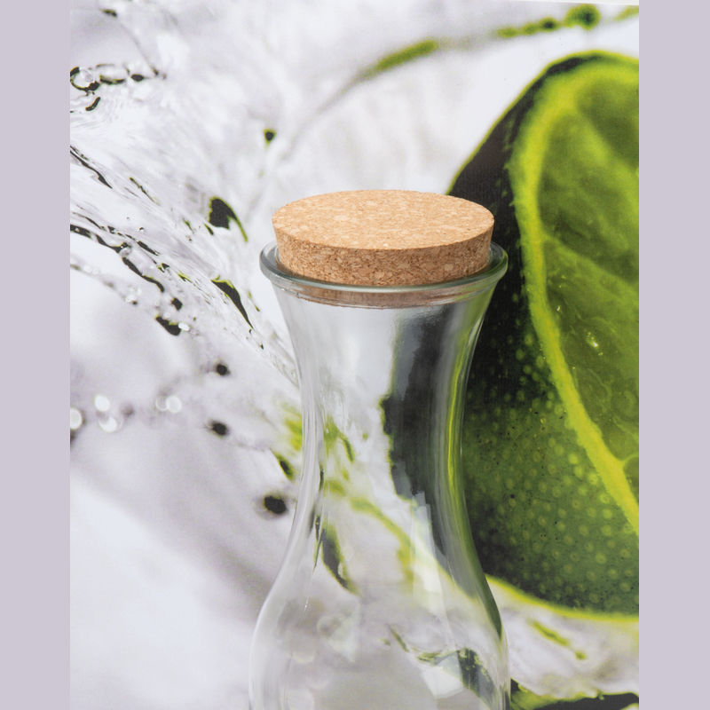 Glass carafe with cork lid and a capacity of 1.000 ml. Your logo will be printed onto the carafe.