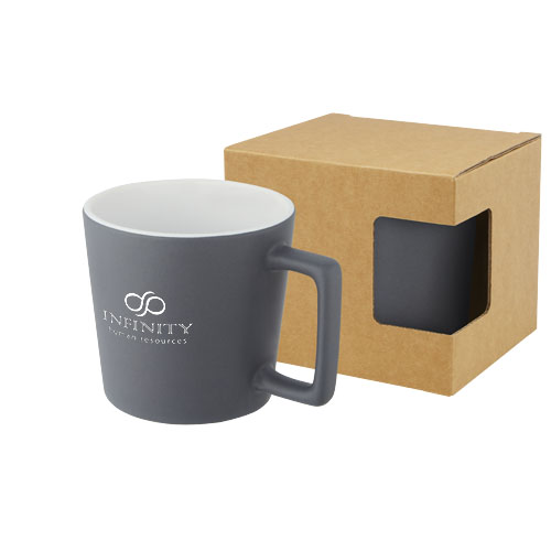 Ceramic mug with a modern design and matt finish. Volume capacity is 370 ml. Dishwasher safe for all decoration methods. Presented in a recycled cardboard gift box.