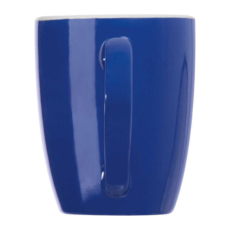 300ml ceramic cup, coloured outside, white inside. Your logo will be printed onto the mug.