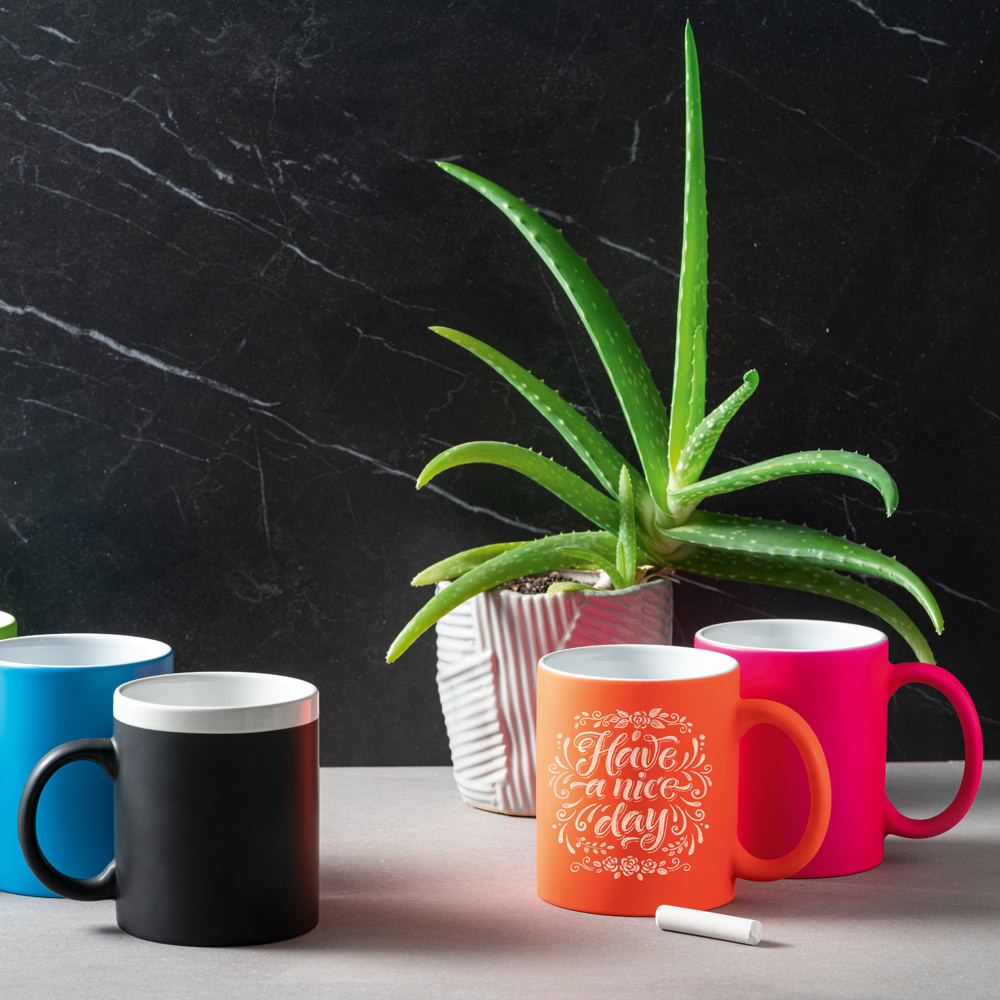 Ceramic mug with neon matte finish and capacity up to 350 mL. The exterior finish of this mug recreates the effect of the slate and allows you to write on it using chalk (not included). Supplied in a gift box. ΓΈ83 x 97 mm | Box: 102 x 117 x 88 mm