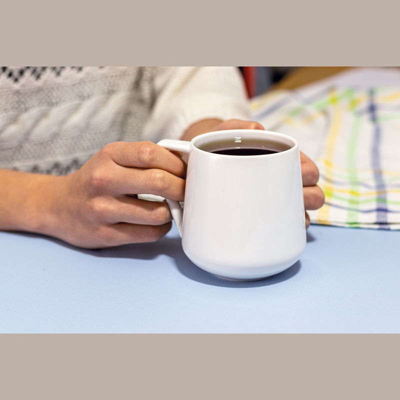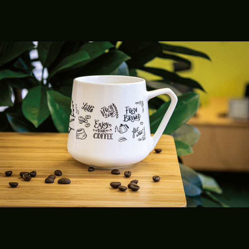 Porcelain cup (300 ml) with an extravagant handle. Your logo will be printed onto the mug.
