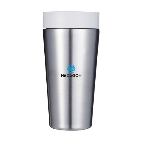Double-walled, reusable coffee-to-go cup with lid, from Circular&Co. The cup is made from 98% recycled stainless steel. The lid is made of PP en 100% recyclable. The insulating effect keeps your drink warm for up to 6 hours or cold for up to 12 hours. The lid of this coffee cup has special innovative features such as a trust-lock™ mechanism and a swift-click™ closure. Press the lid to drink. Click on the lid to close the cup and lock the lid. You can easily do this with one hand. In addition, the lid has a clear open and close position for an even better 360-degree drinking experience, allowing you to drink from every angle. This ideal cup is therefore 100% leak and spill-free and ideal for on the go. Dishwasher-safe. Washing by hand is recommended to preserve the imprint. Including instructions for use. Capacity 340 ml. Packed individually.