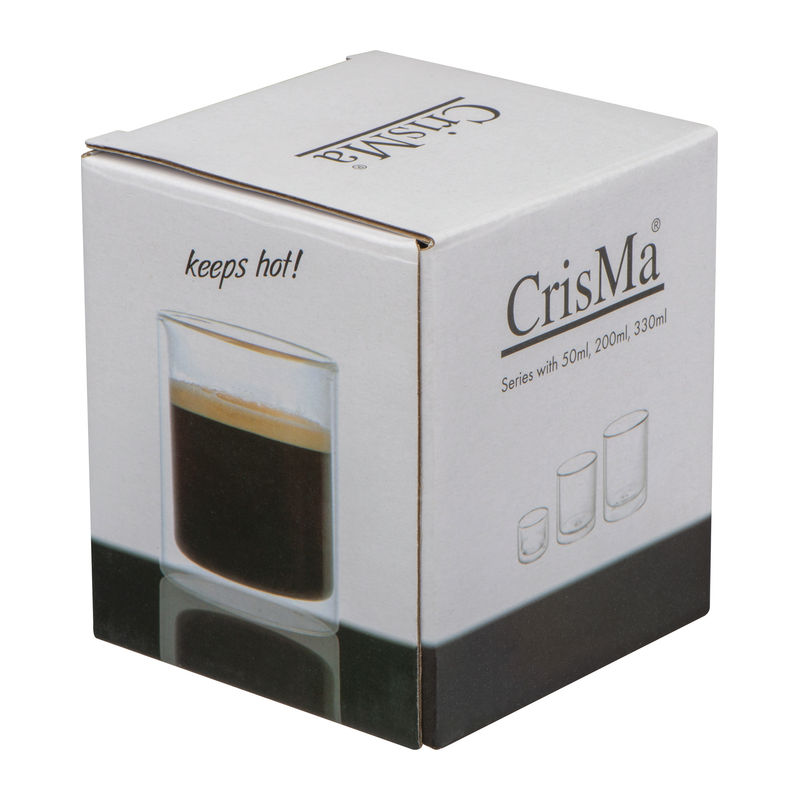 Double-walled CrisMa glass cup made of borosilicate glass with a capacity of 200ml. Keeps drinks hot and cold! We print your logo on the glass.