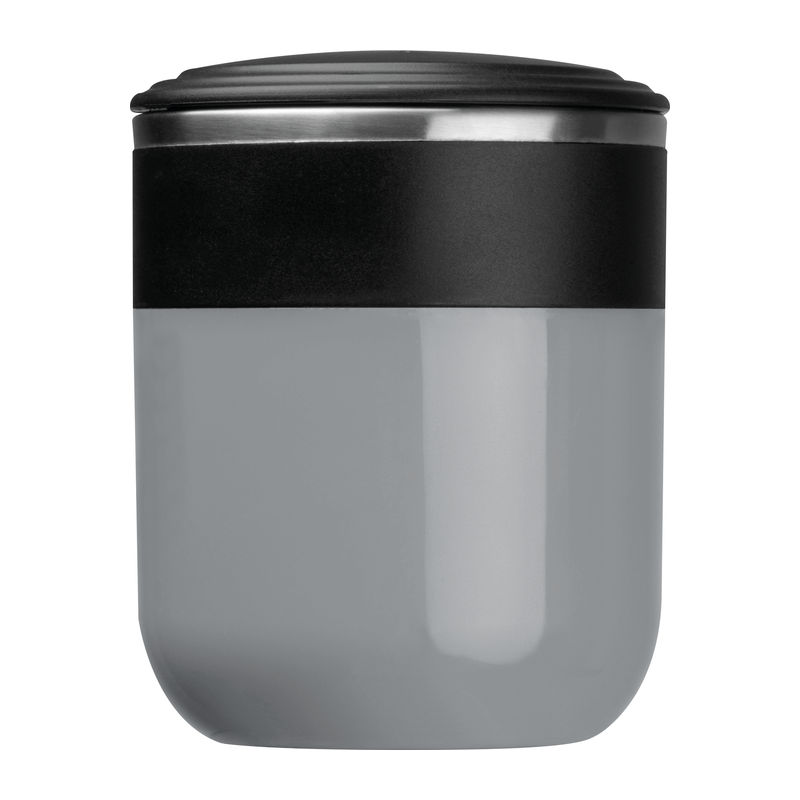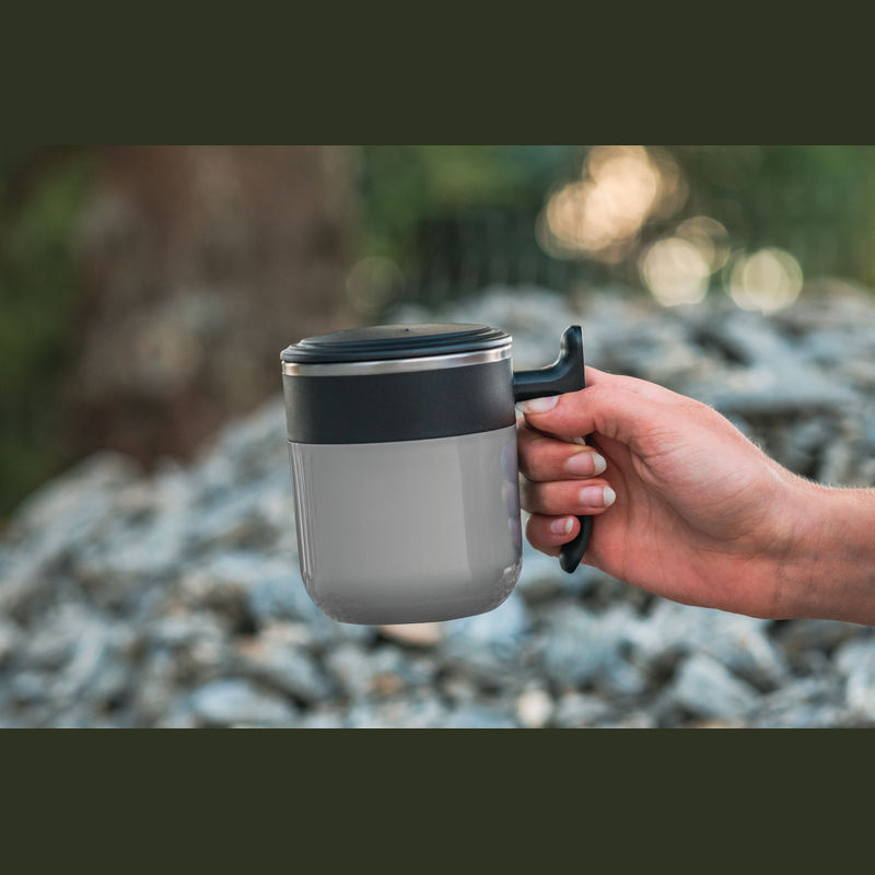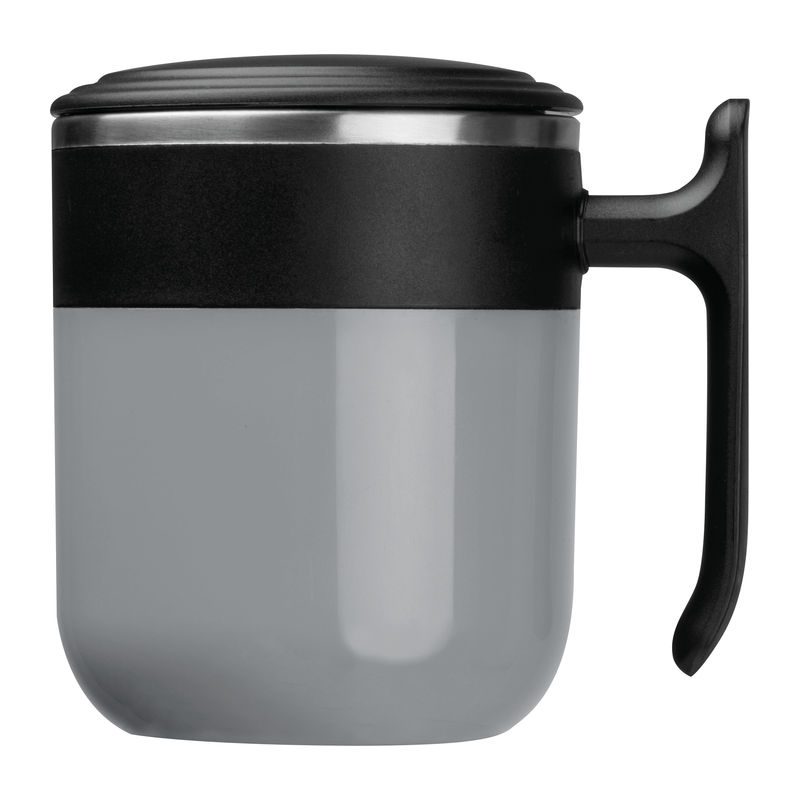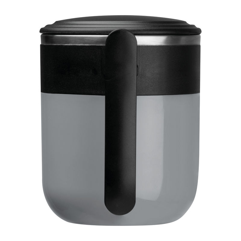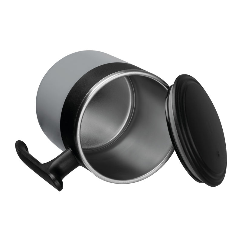 Double-walled stainless steel drinking cup featuring a non-slip base and handle, with a filling capacity of 300 ml. Supplied individually packaged in a cardboard box.