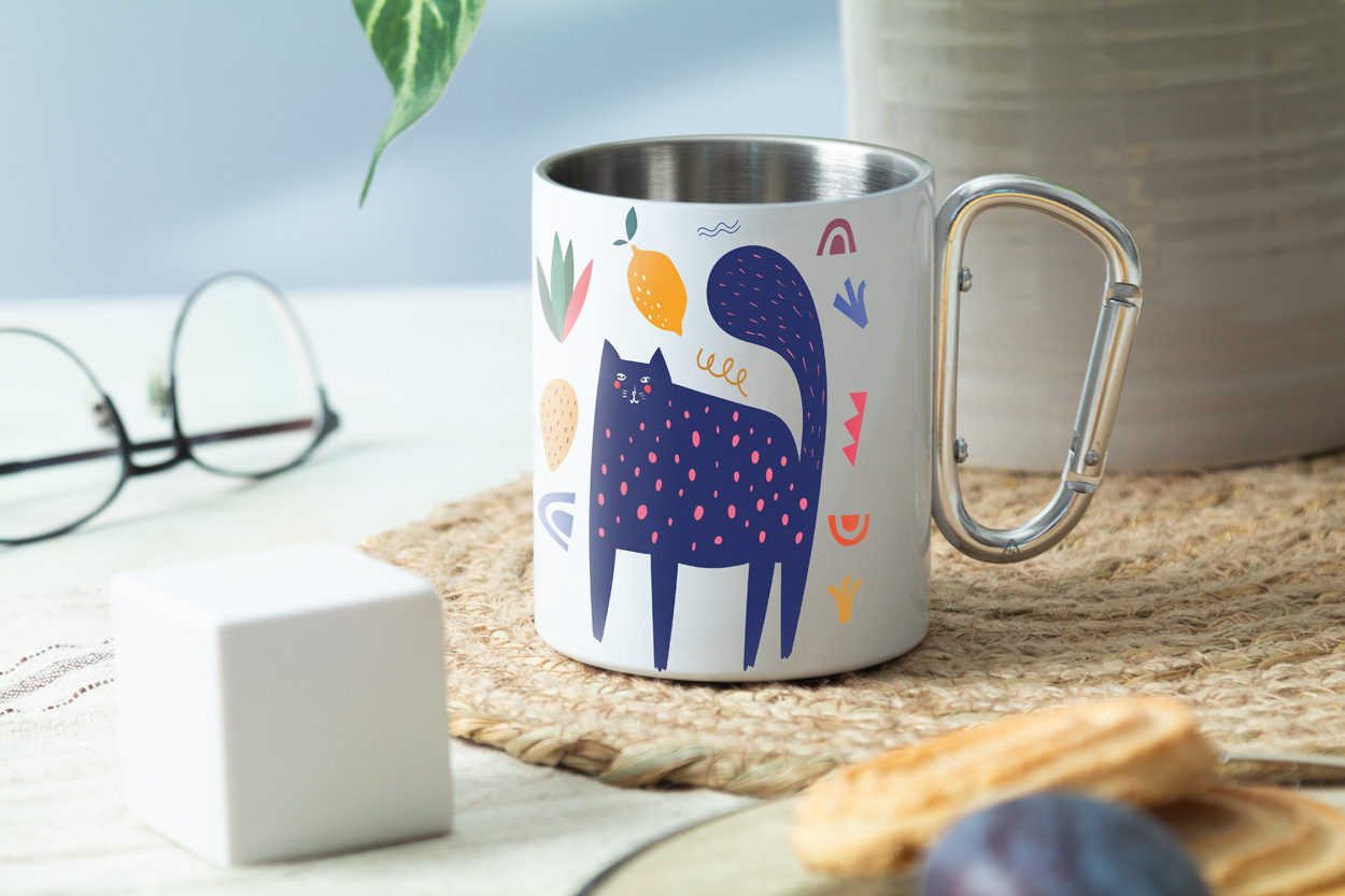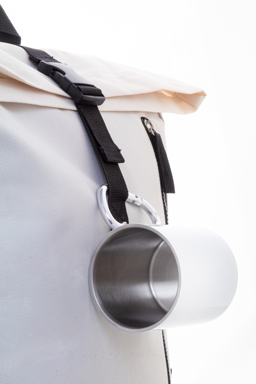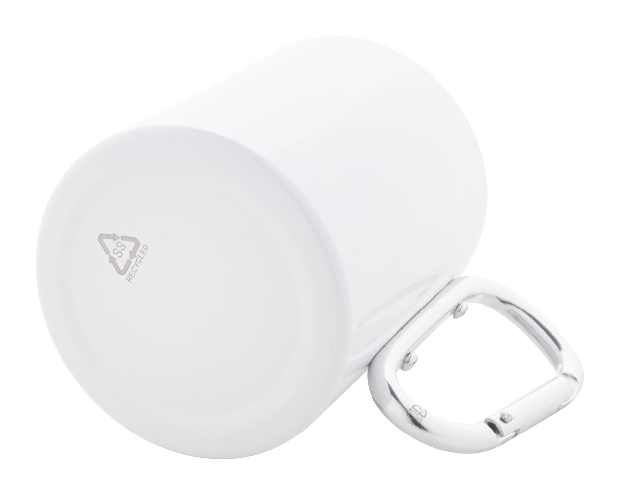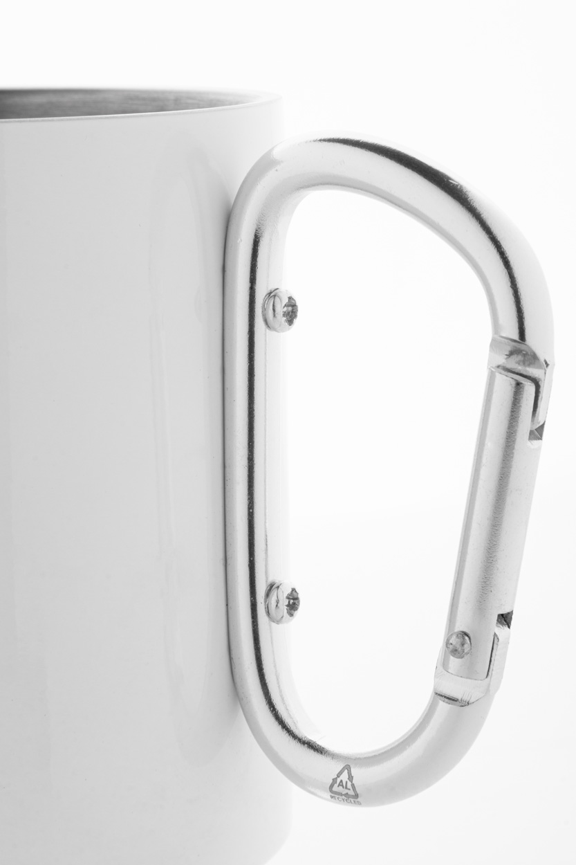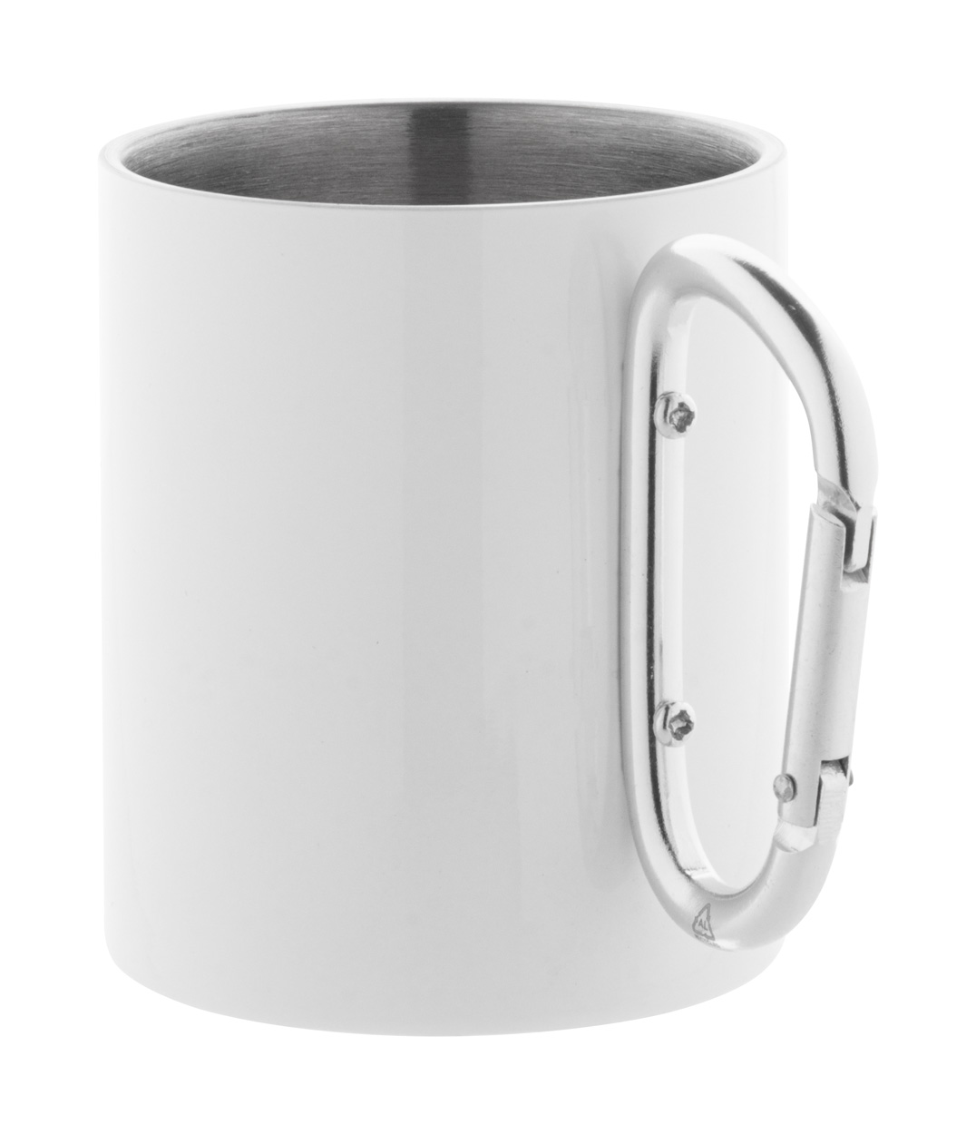 Double-wall, recycled stainless steel sublimation thermo mug with recycled aluminium carabiner handle. 300 ml. In kraft paper box.