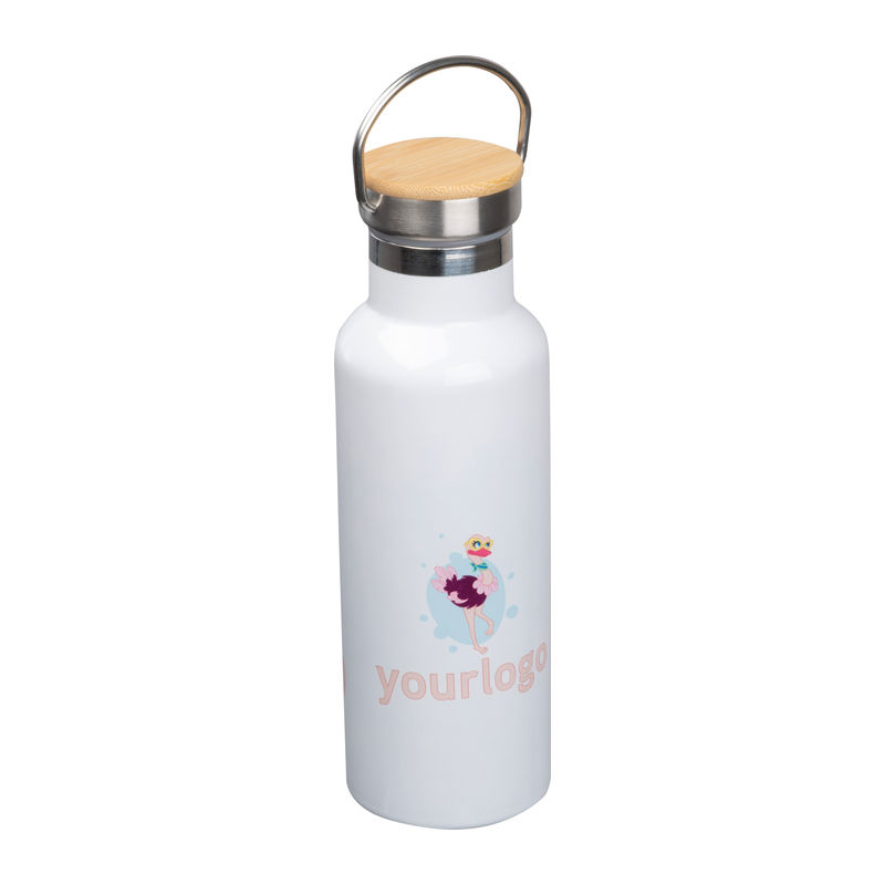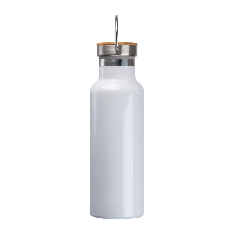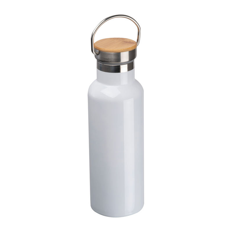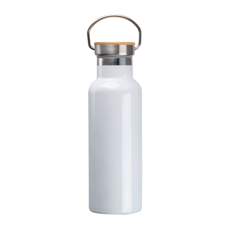 Double-walled sublimation drinking bottle made of stainless steel with a capacity of 500ml and a carrying handle. Your logo is applied to the bottle by sublimation.