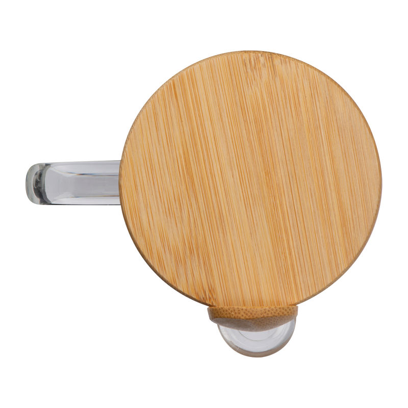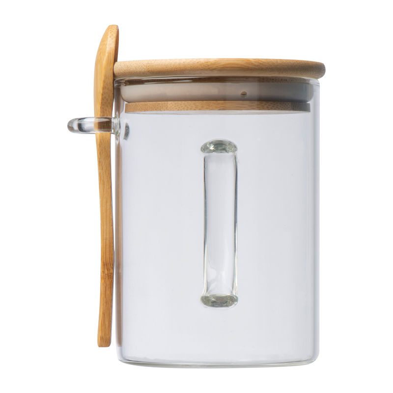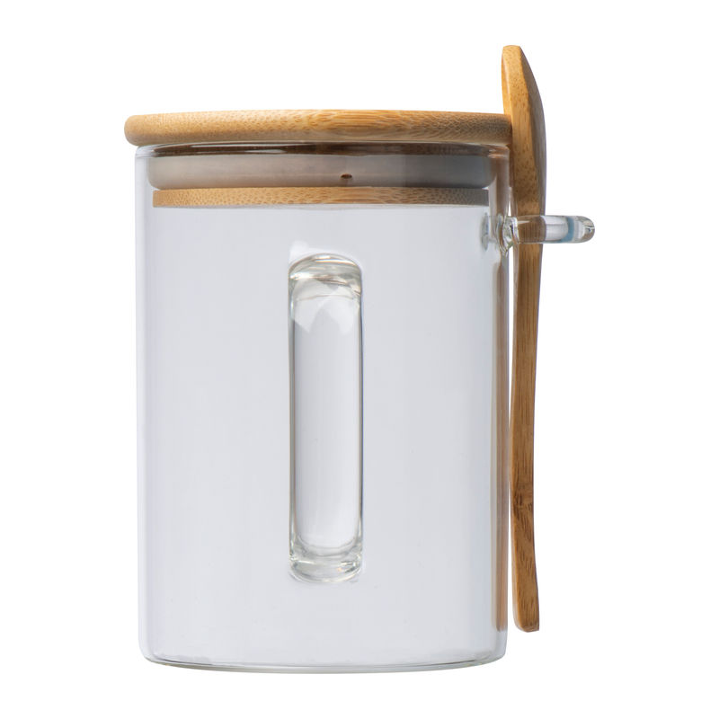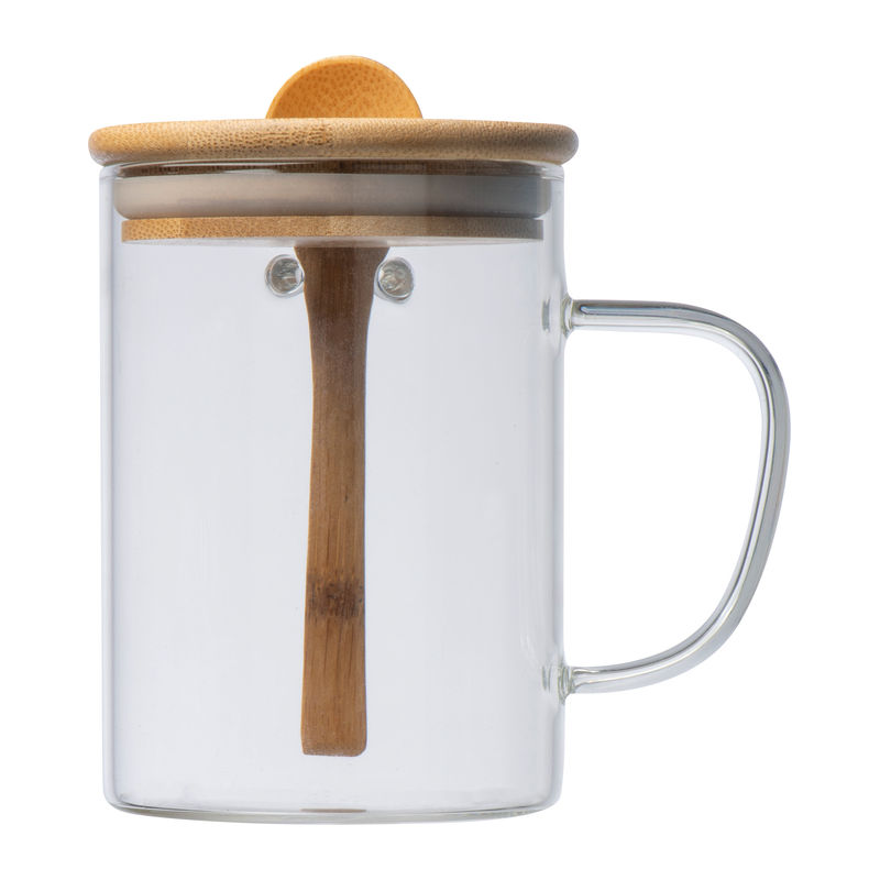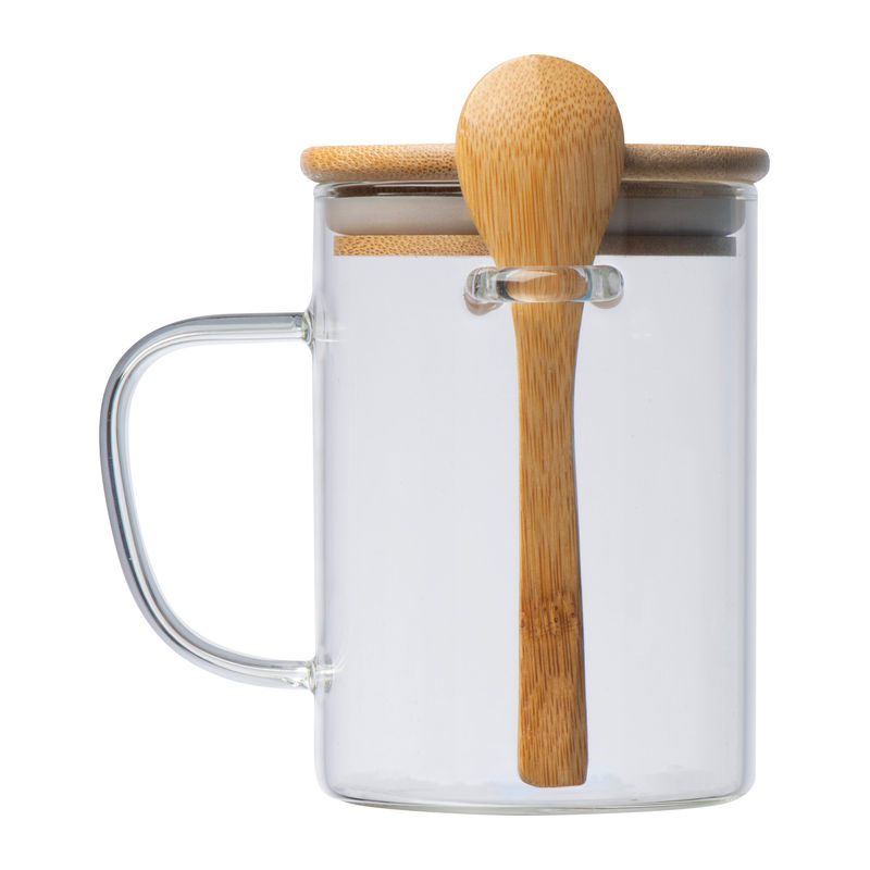 Borosilicate glass mug featuring a closable bamboo lid and an integrated bamboo spoon, with a capacity of 420 ml. Supplied individually packaged in a cardboard box. Each unit and engraving is unique due to the natural bamboo material.