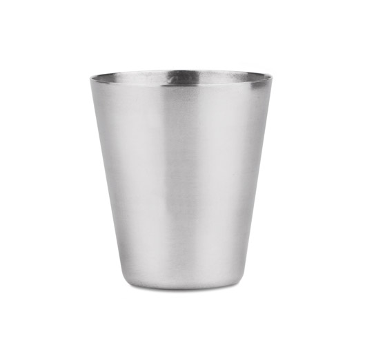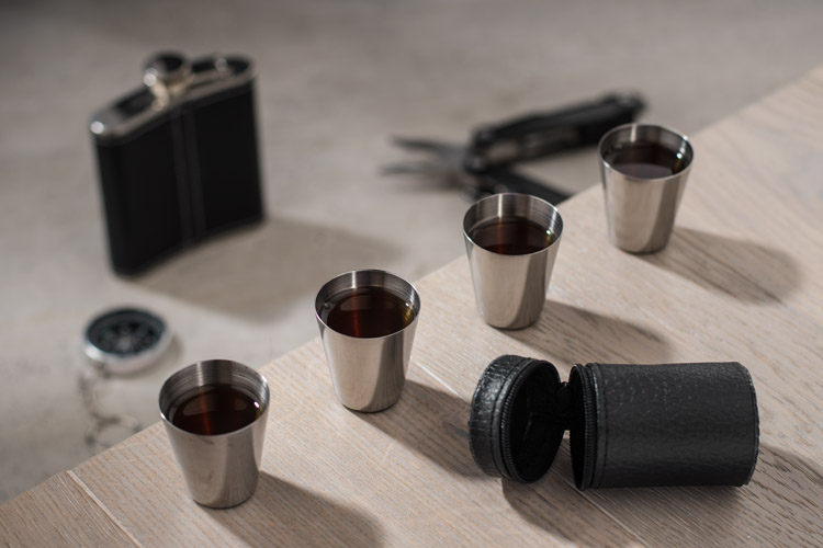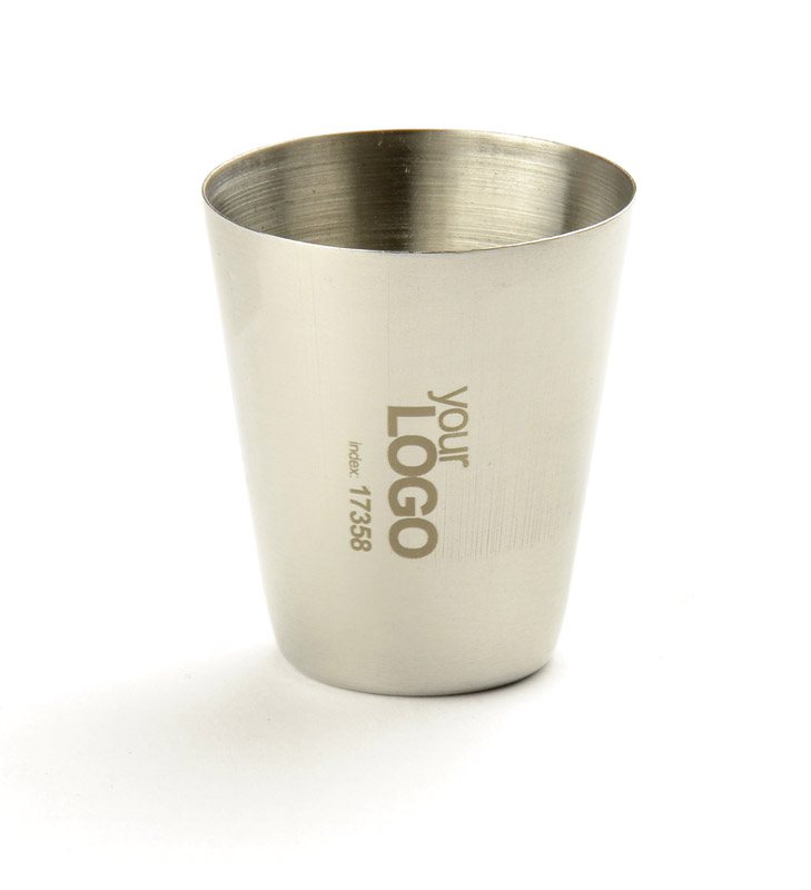 Four stainless steel cups packed into a PU leather case with a zip closure. The capacity of each of these cups is 30ml. Logo might be engraved on the cup's surface.