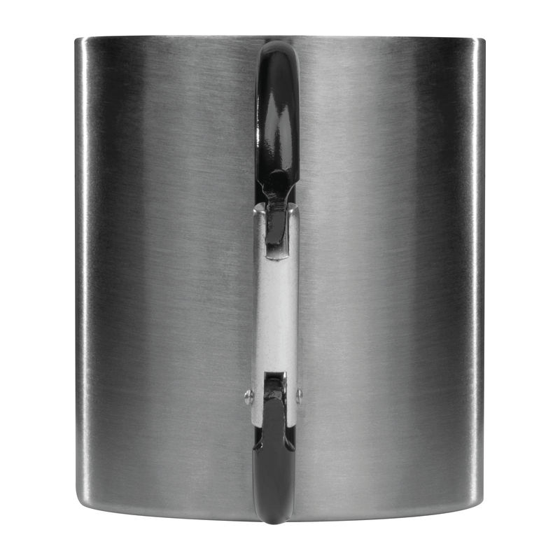 Double-walled, stainless steel cup with coloured snap hook and a 220 ml filling capacity. Your advertisement will be engraved on one side.