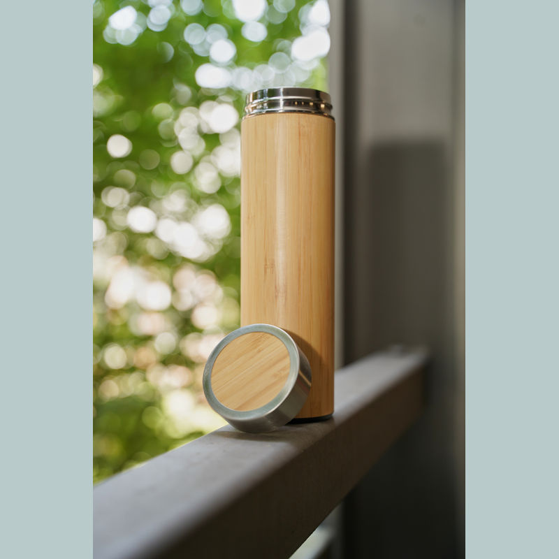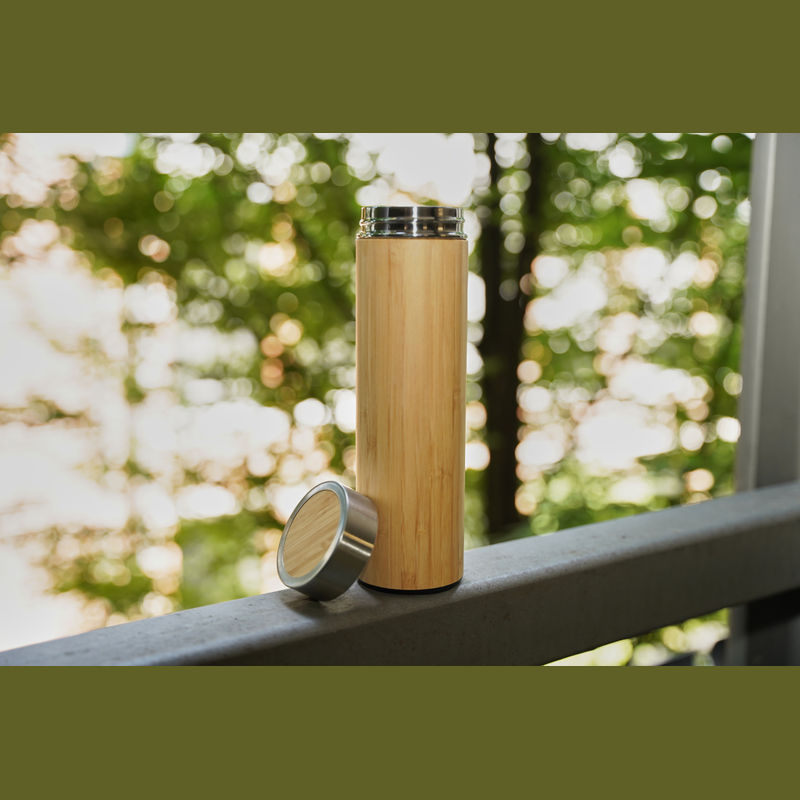 Leak-proof, double-walled vacuum insulated flask made of stainless steel with a bamboo casing, strainer, stainless steel lid, and a capacity of 550 ml. Each unit and engraving is unique due to the natural bamboo material.