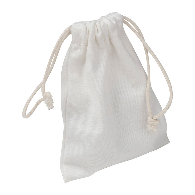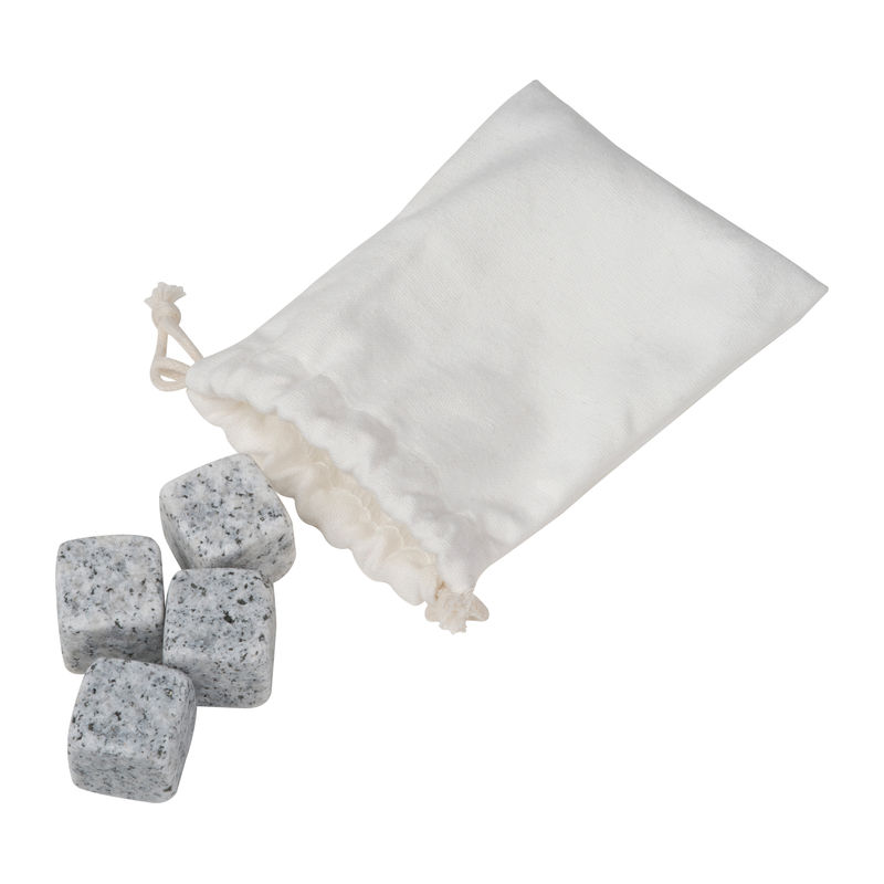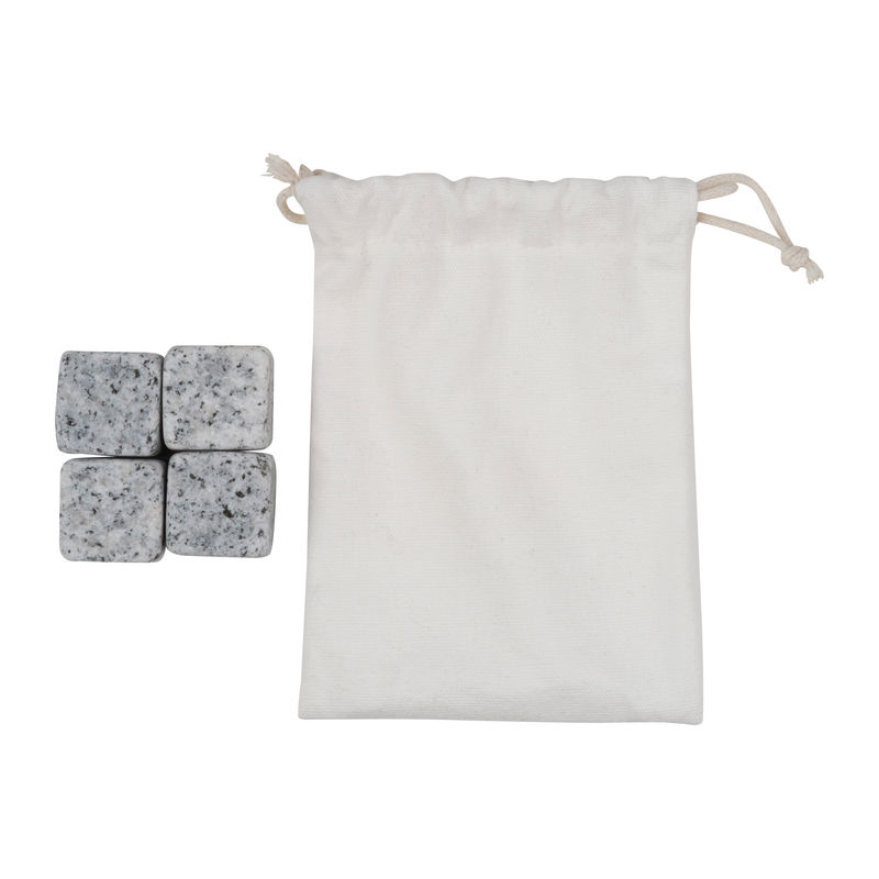 Set of four light-coloured ice cube stones, elegantly presented in a natural cotton pouch. Reusable and ideal for chilling beverages without dilution. A sophisticated alternative to conventional ice cubes.