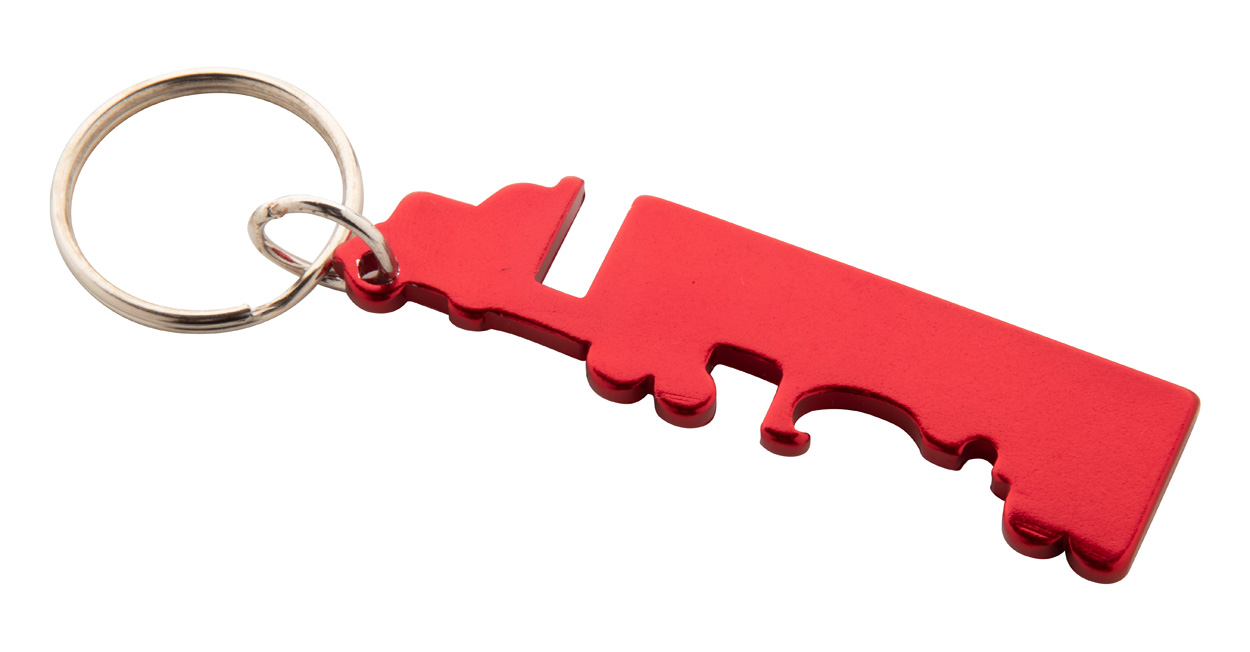 Truck shaped aluminium keyring with bottle opener function.