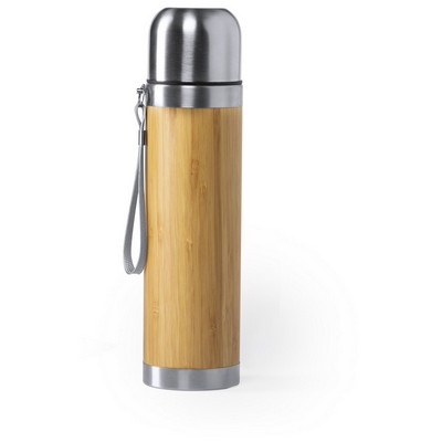 Bamboo vacuum flask 420 ml with wrist cord, double vacuum walled, stainless steel inside and outside, thermal insulation scale: 4 +leakproof