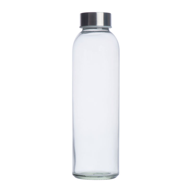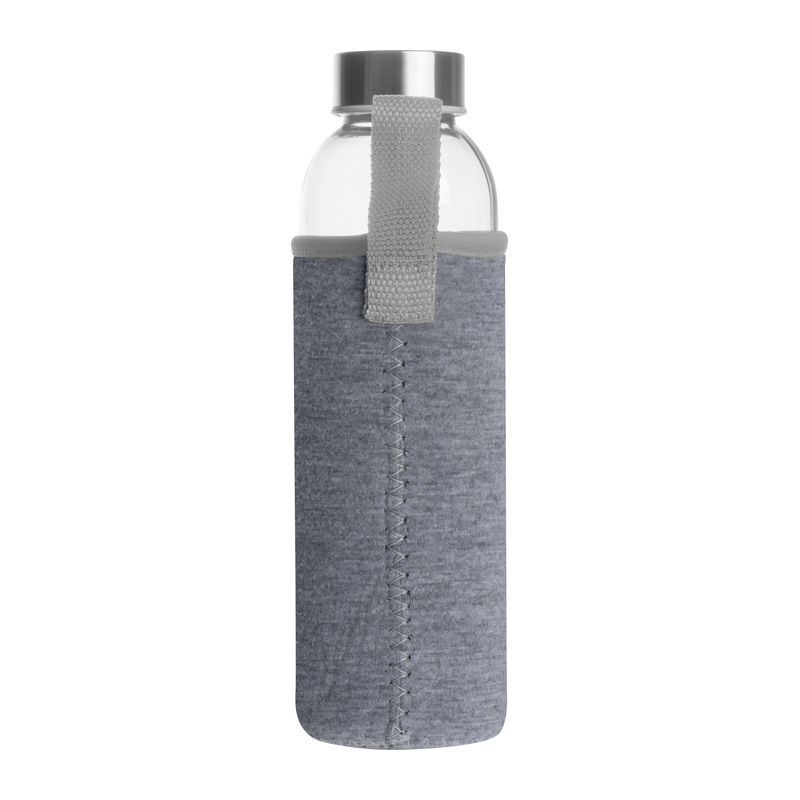 Glass drinking bottle encased in a neoprene pouch featuring a carrying strap and a metal lid. Capacity: 500 ml.