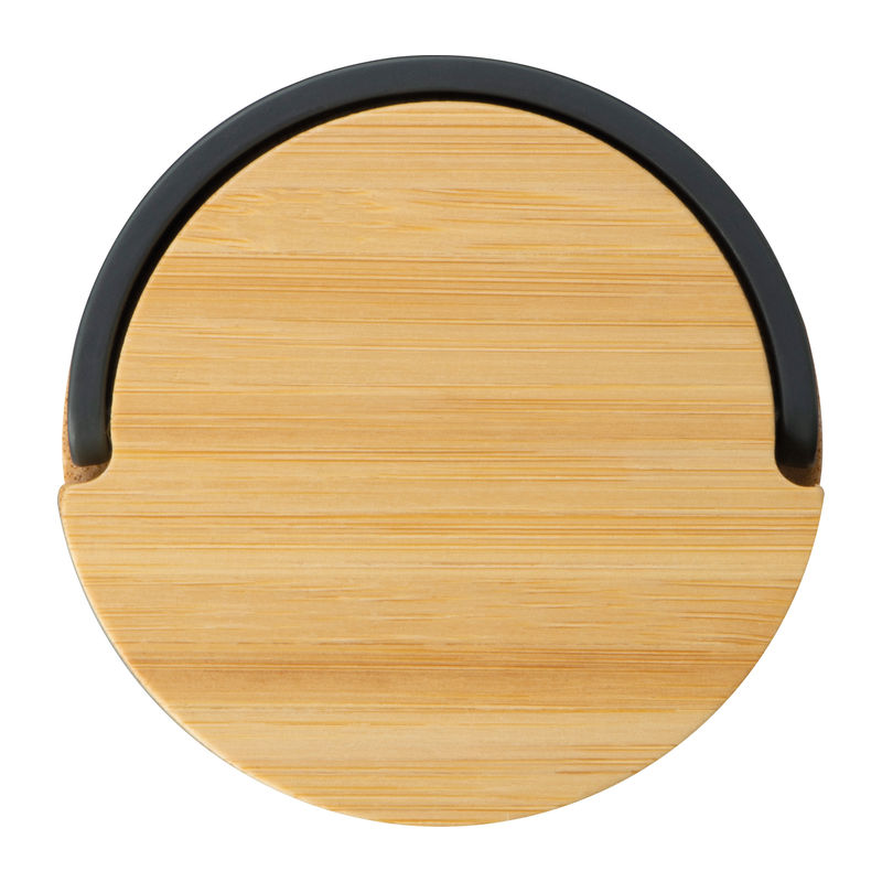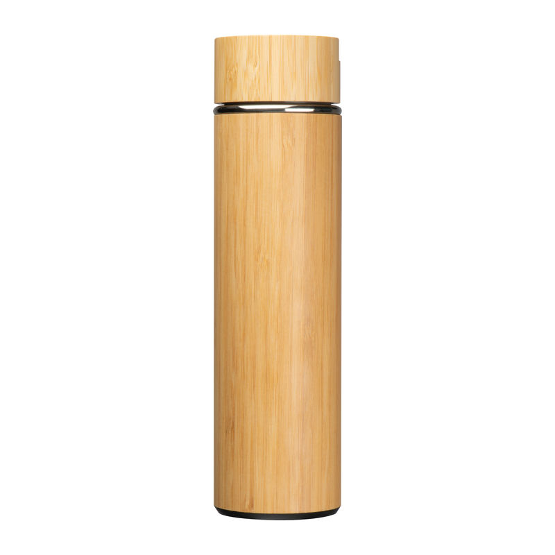 Double-walled stainless steel drinking bottle made of bamboo with a tea strainer, a capacity of 500ml and a handle in the lid. Your logo will be engraved onto the bottle.