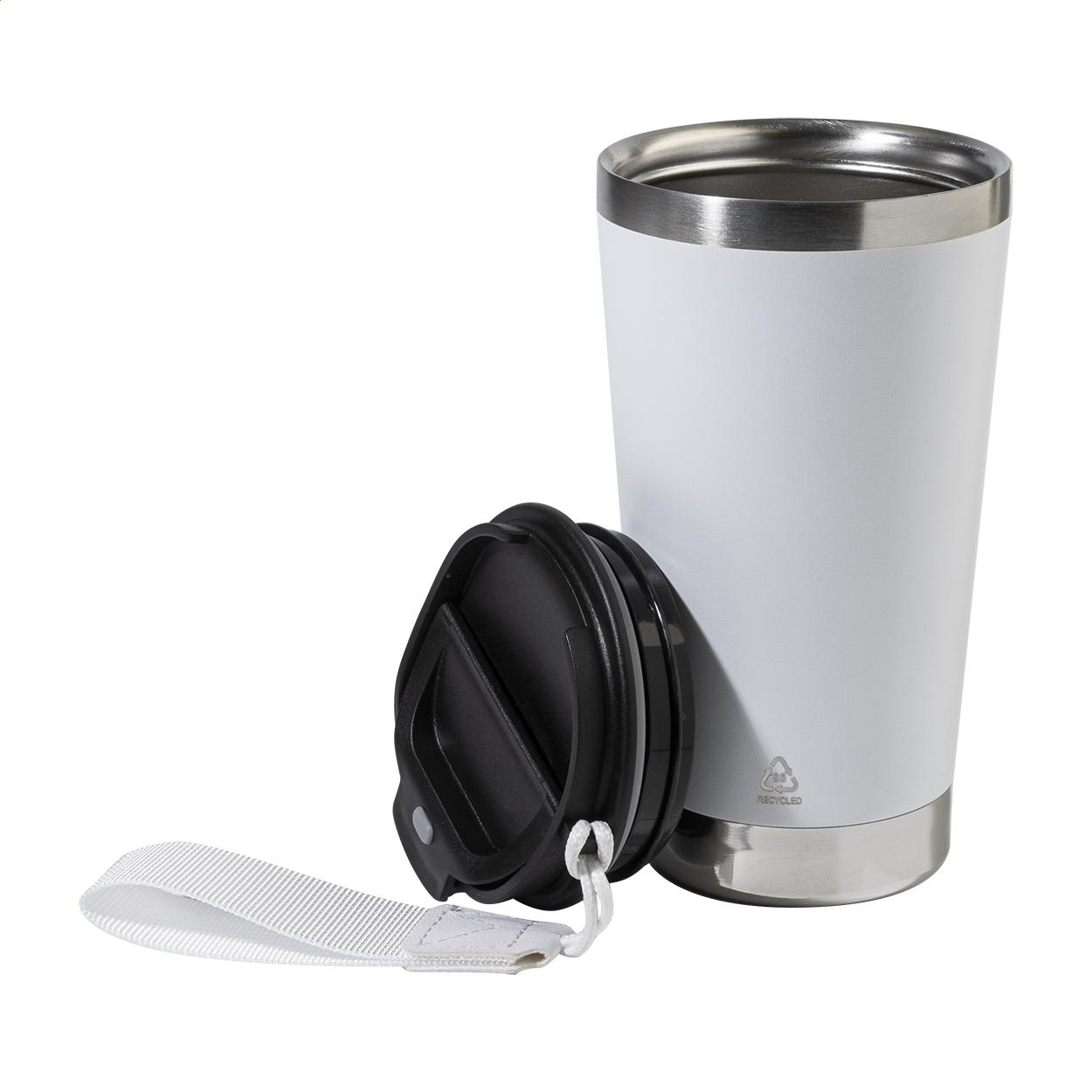 Double-wall, recycled stainless steel insulated thermo cup with PP drinking lid and matching colour carrying strap. 430 ml.