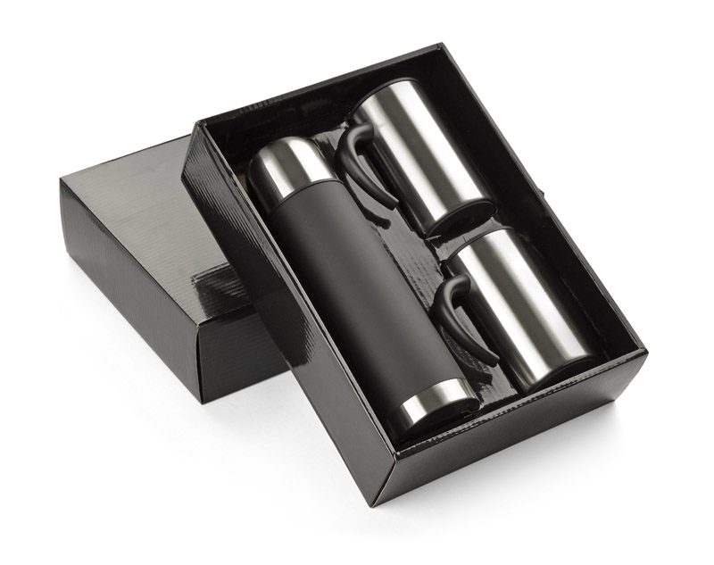 500ml stainless steel vacuum flask and 2 mugs (with 260ml capacity each). The set is packed into a black cardboard box.