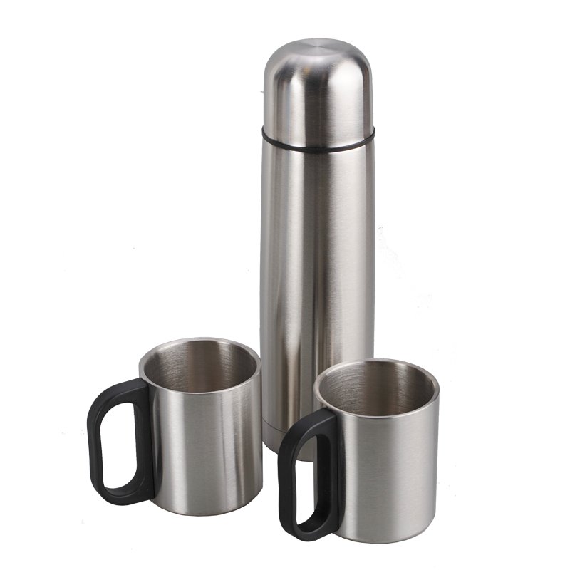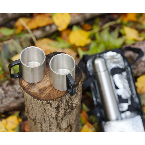 Insulated cooler set containing 450 ml double wall vacuum flask, two 180 ml insulated mugs with 18/8 upgraded stainless steel inside and shoulder cooler bag. It keeps temperature of 40 degrees Celsius for 20 hrs.