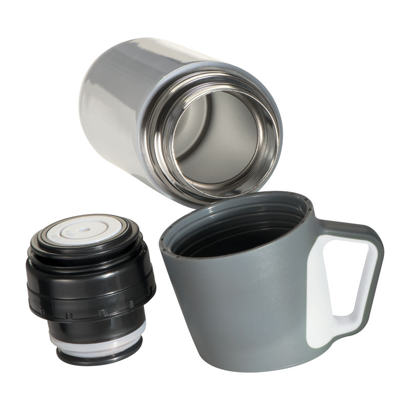Leak-proof, double-walled stainless steel vacuum-insulated thermos bottle featuring an integrated mug within the lid. Capacity: 500 ml.