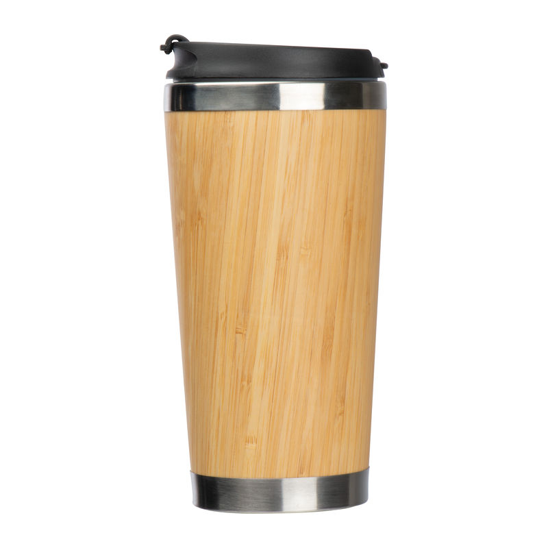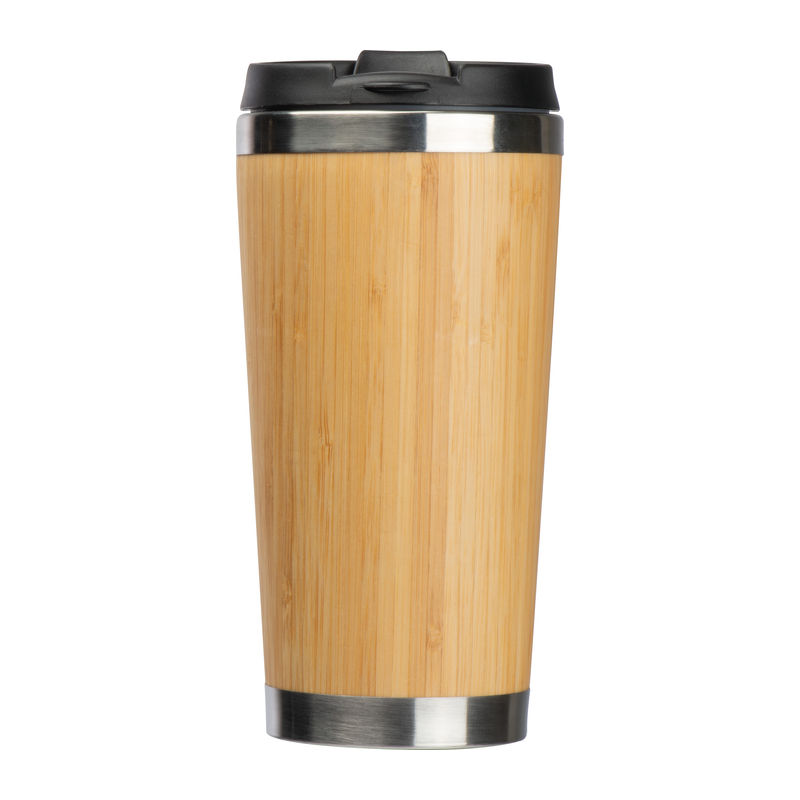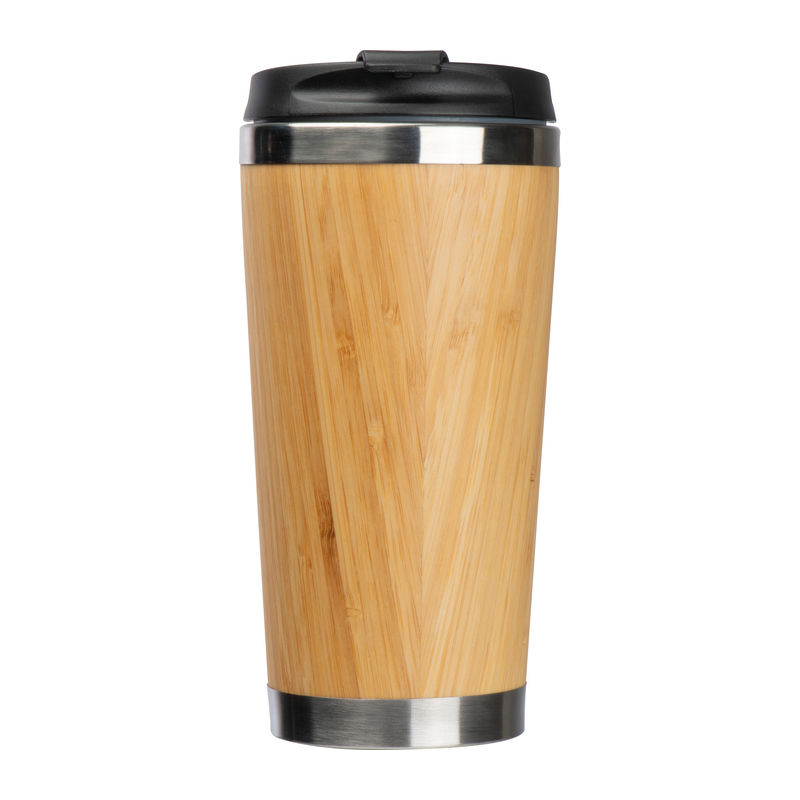 Double-walled stainless steel travel cup with a bamboo finish, leak-proof design, and 400 ml capacity. Each unit and engraving is unique due to the natural bamboo material.