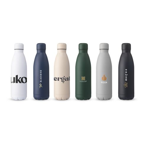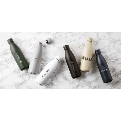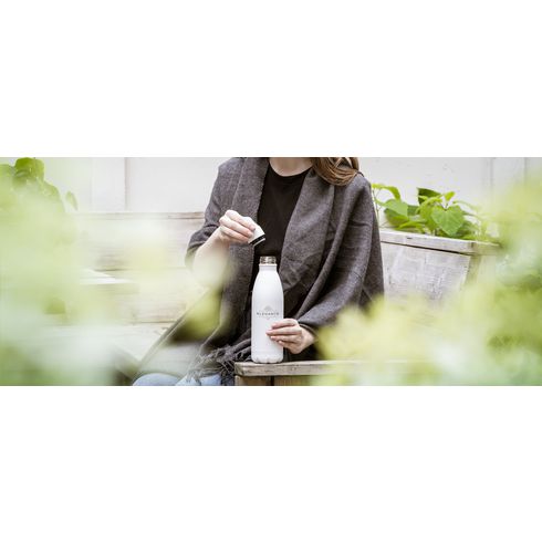 Double-walled, leak proof water/thermos bottle made from recycled stainless steel. Supplied in a modern matte finish with matching screw cap, this bottle has a striking appearance. This slim bottle will fit cup holders in a wide range of cars and is the perfect thirst quencher whilst on the go. Not dishwasher-safe. RCS-certified. Total recycled material: 85%. Capacity 500 ml. Stainless steel can be recycled many times whilst retaining the quality of the material. By using recycled stainless steel, fewer new raw materials are needed. This means less energy consumption and less use of water. Packed individually.
