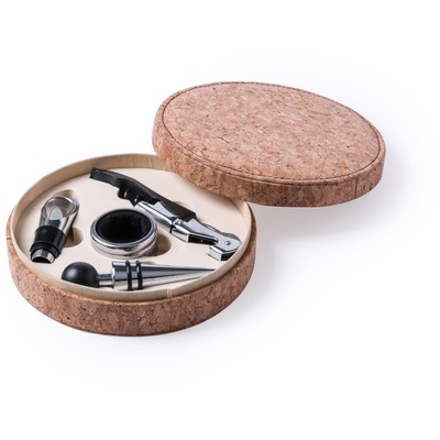 Wine set 4 pcs in natural cork box, wine accessories: waiter's knife, ring, stopper and wine pourer