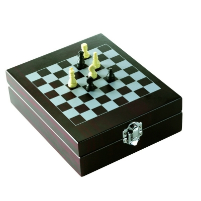 Wine set 5 pcs in wooden box, chess game and wine accessories: thermometer, bottle ring, stopper, waiter's knife