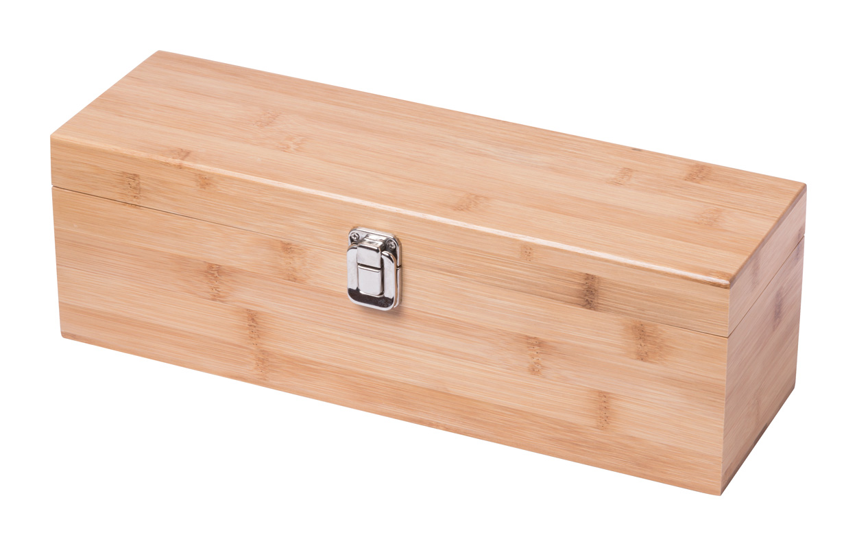 Bamboo wine set with corkscrew, drop stopper, nozzle and plug. In bamboo box with a compartment for a bottle of wine. Delivered without bottle.