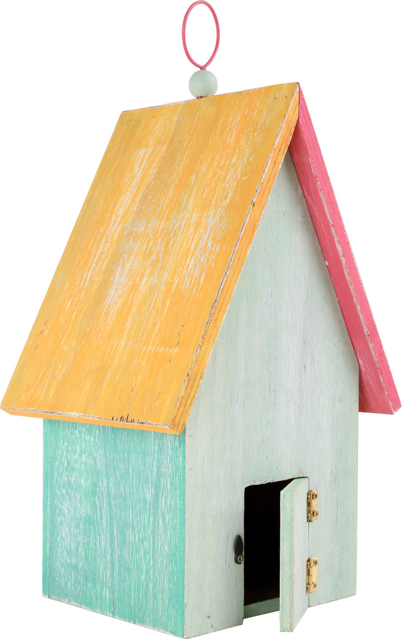 All the members of a small bird family will love their new home. The "Hey sunshine" motto welcomes its new inhabitants. This bird house made of wood in attractive pastel shades has a perch for a short break from nest building and looking for food. The house is hung up by a round wire decorated with a bead. A small door at the back can be opened to clear the house out.