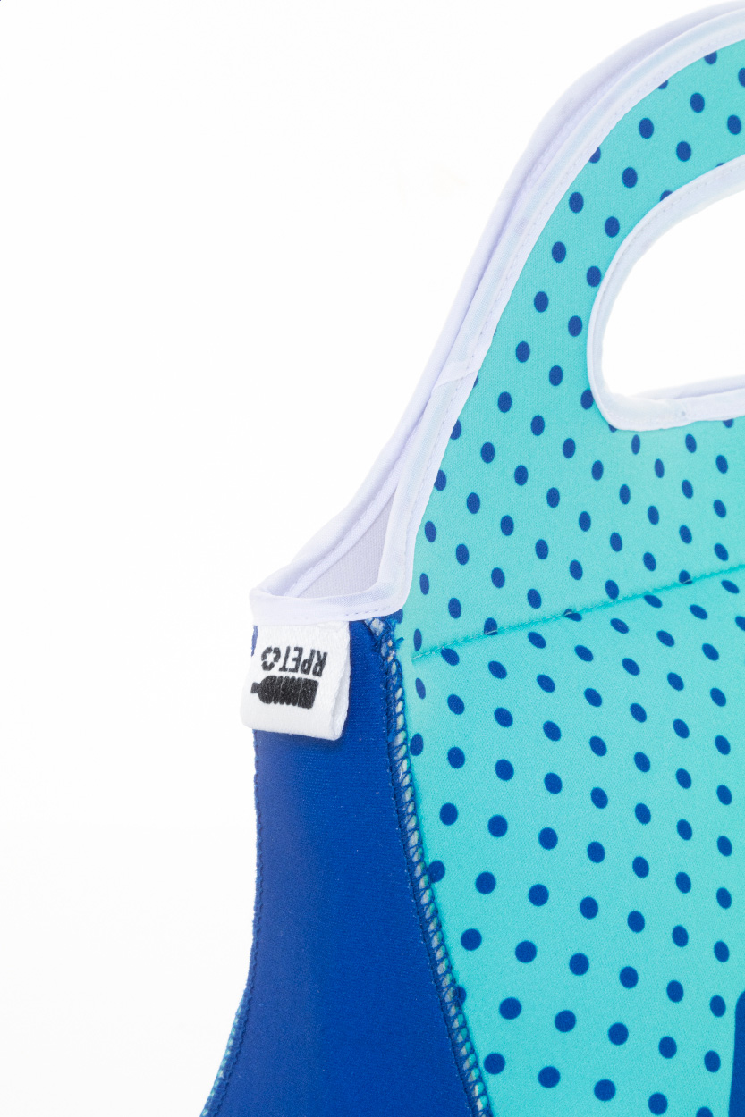 Custom made, RPET neoprene lunch bag with zipped compartment and handles. With all over sublimation printed graphics and distinctive RPET label. MOQ: 25 pcs.