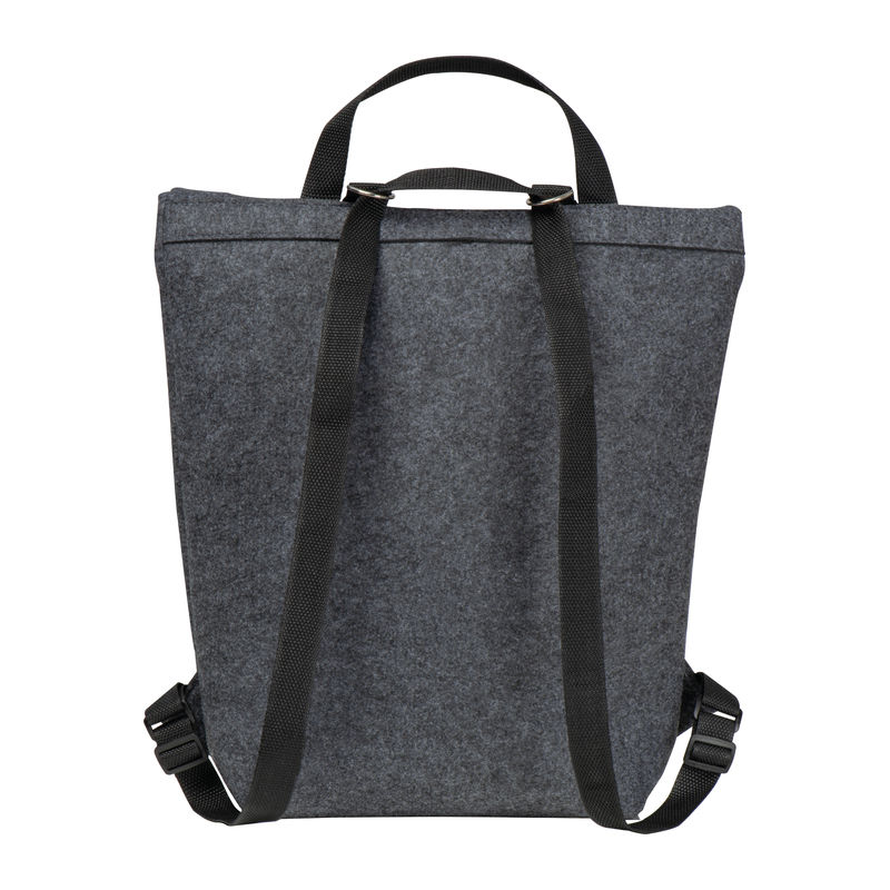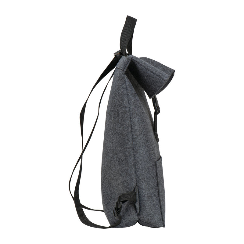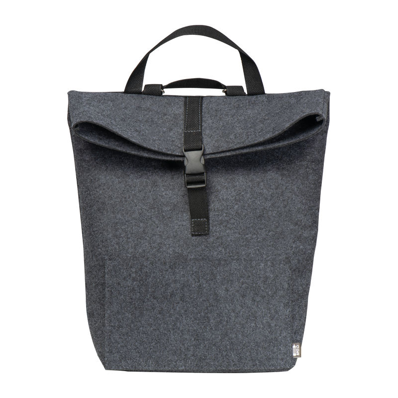 Large rucksack made of RPET felt with flap and front pocket. We will print your logo on the front pocket.