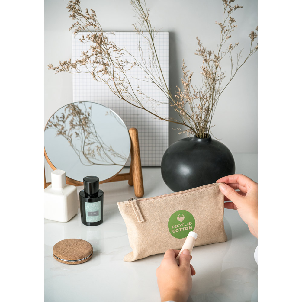 Multifunction bag in recycled cotton (70%) and polyester (30% rPET) (140 g/m²), with lined interior in 100% cotton (120 g/m²). 225 x 120 mm