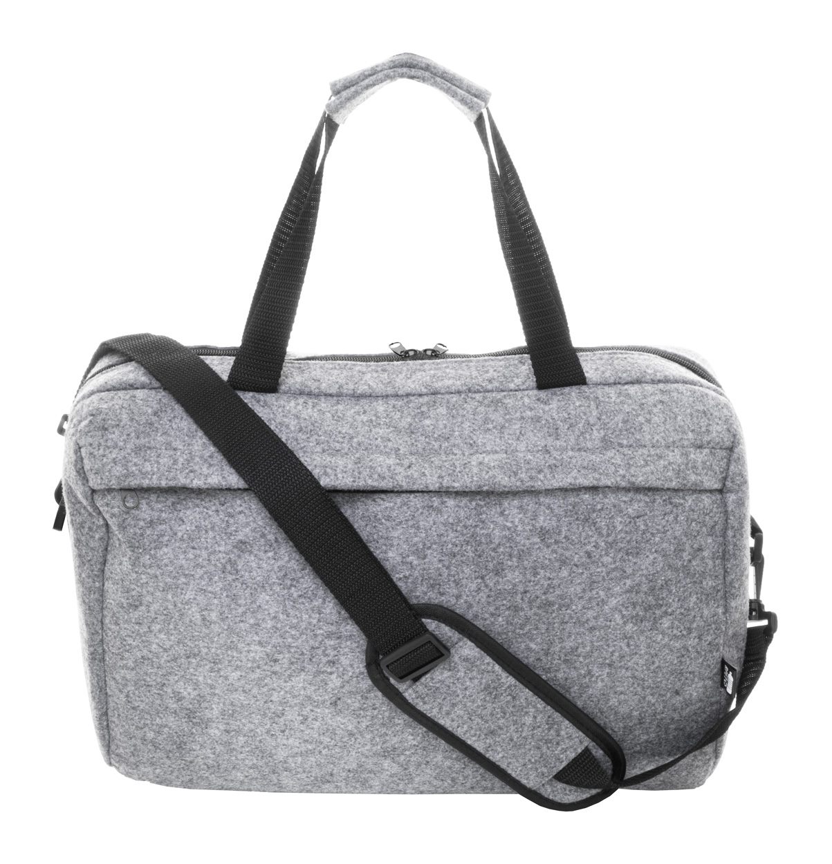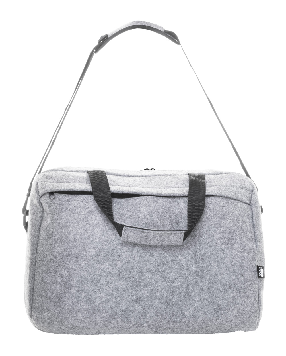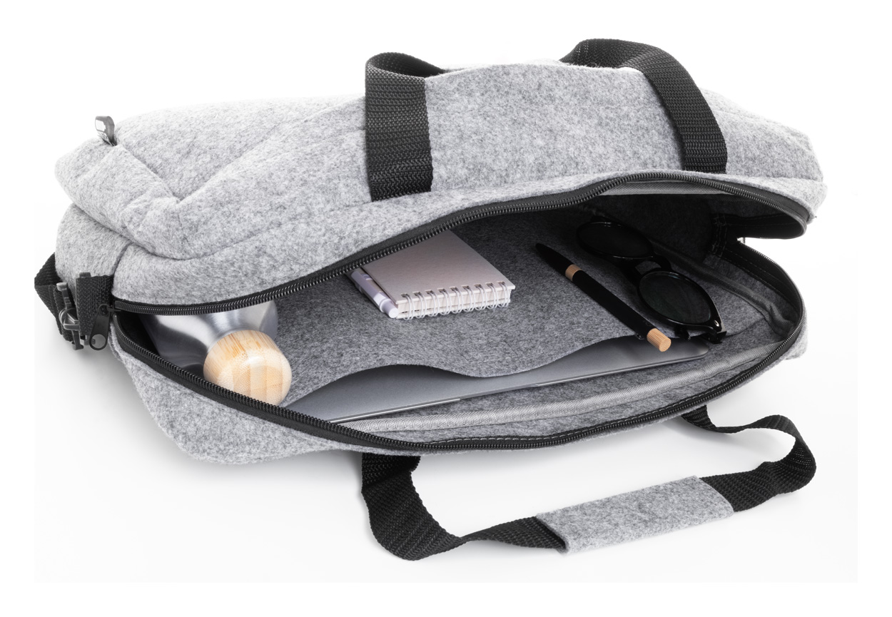 RPET felt document bag with zipped main compartment and front pocket. With laptop (15") compartment, trolley strap and adjustable shoulder strap. With distinctive RPET label.