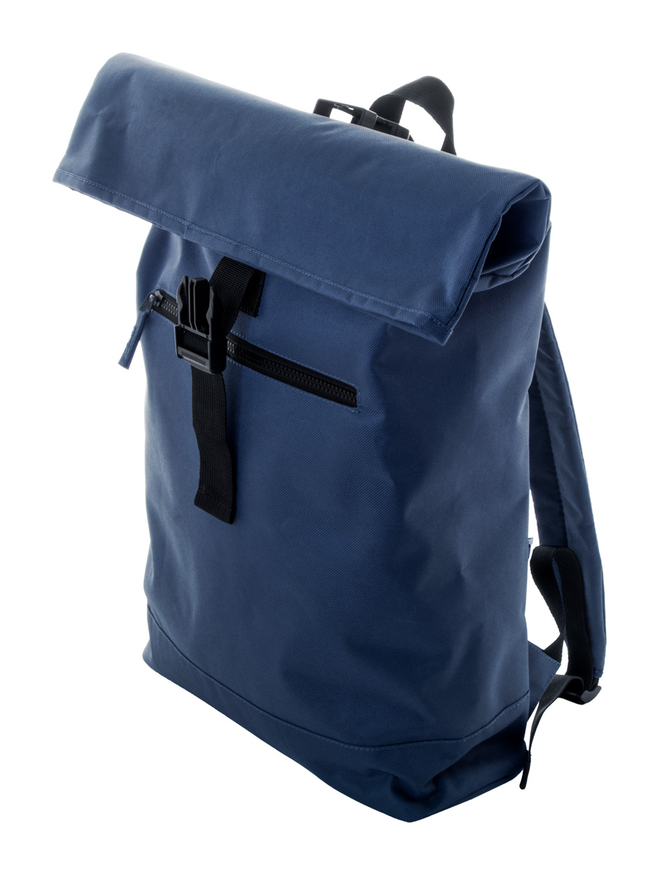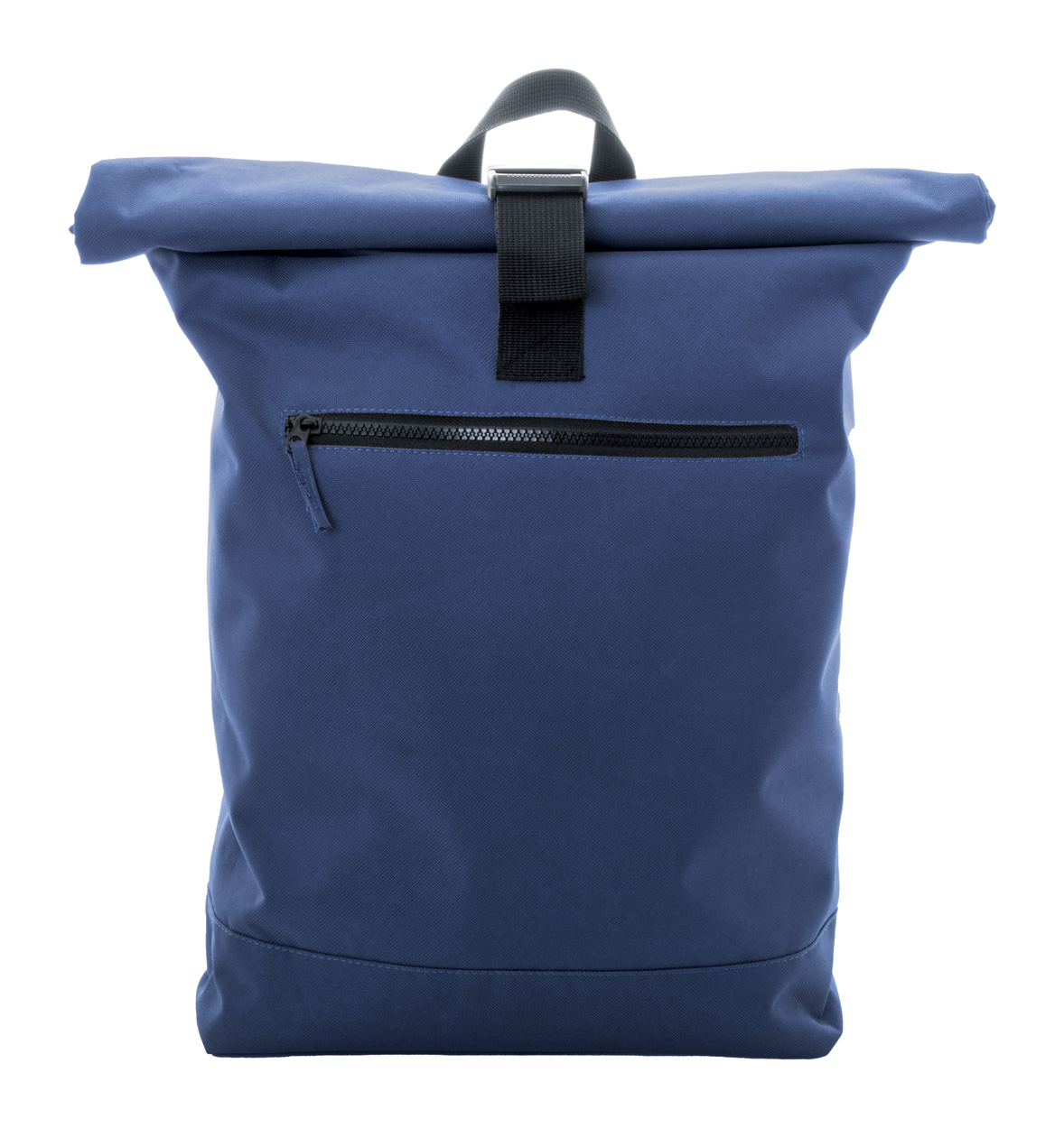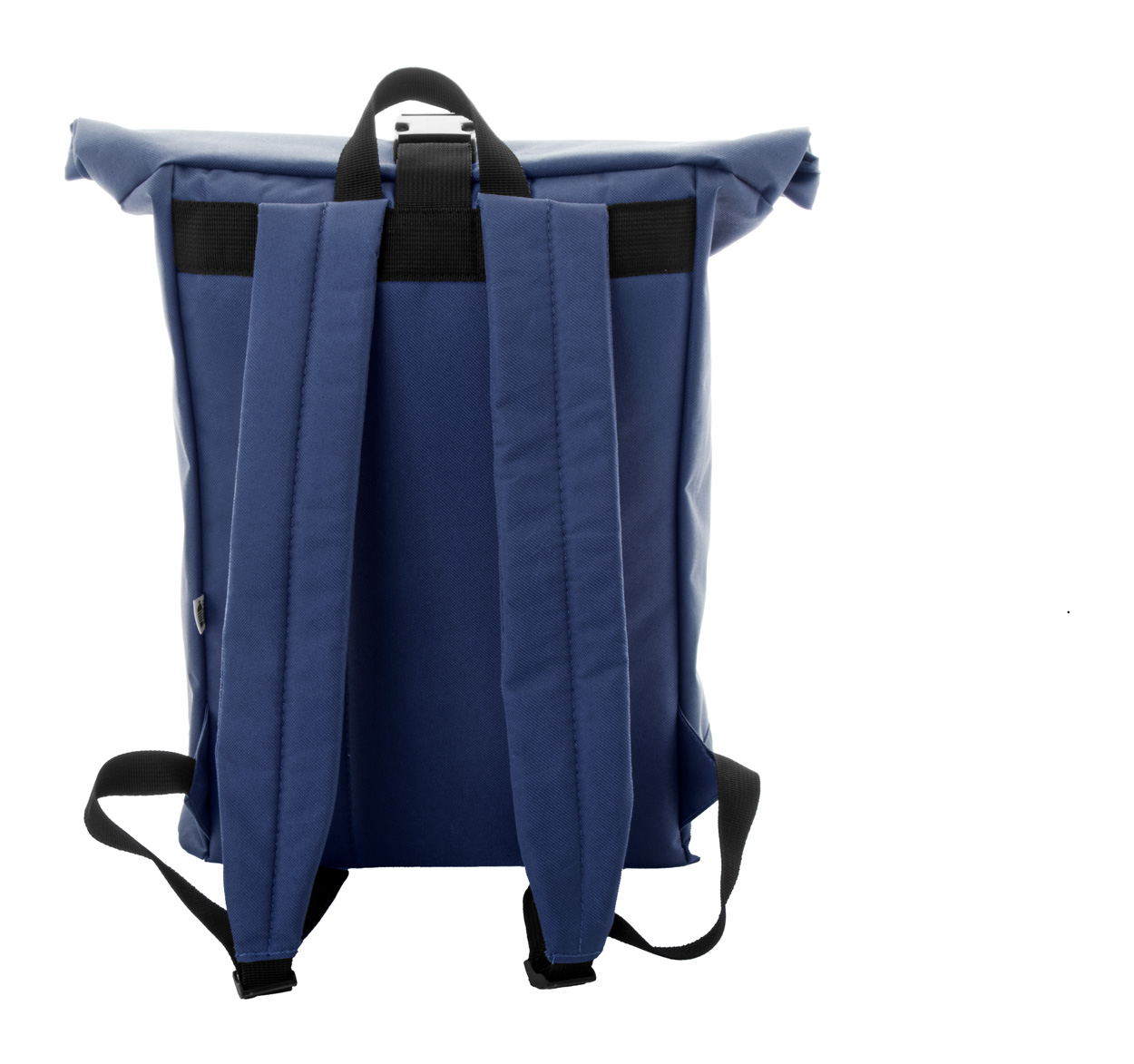 RPET rolltop backpack with buckle closure, zipped front pocket, padded laptop (15") compartment, padded back and shoulder straps. 600D RPET polyester with distinctive RPET label.