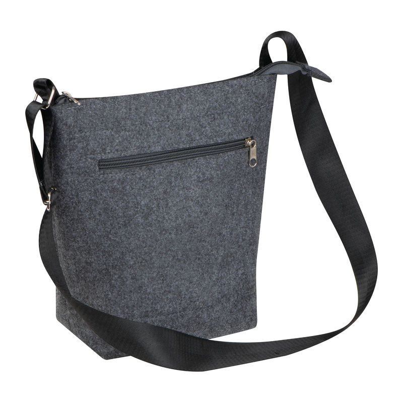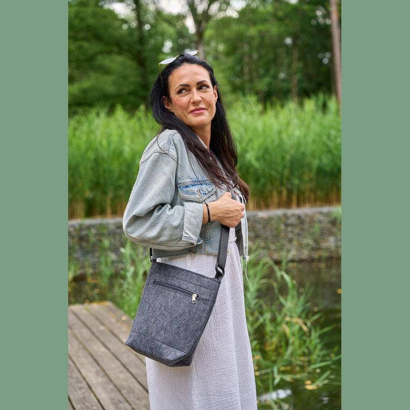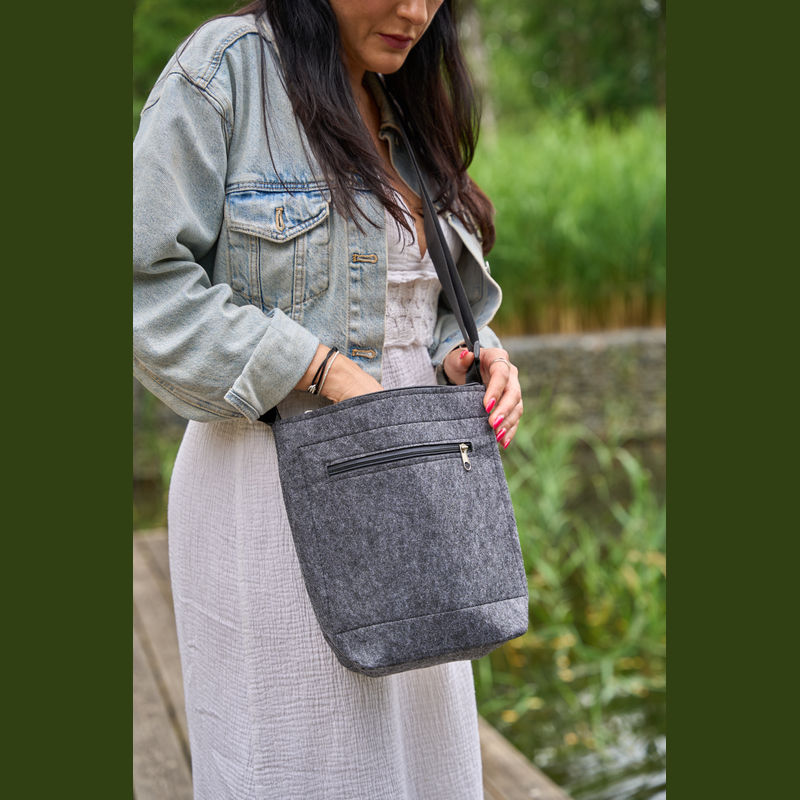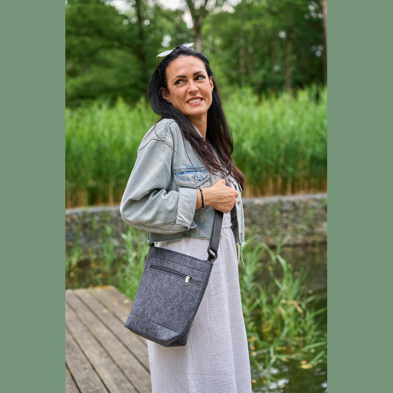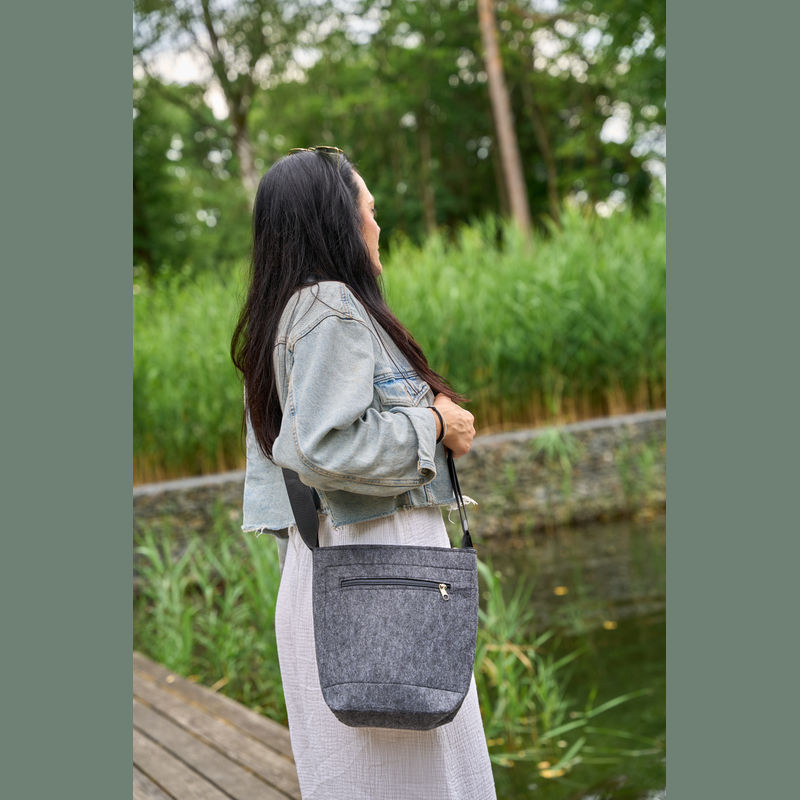 Shoulder bag crafted from recycled felt, featuring a front pocket with zipper. Equipped with adjustable straps for personalised comfort. Practical, ideal for everyday use.