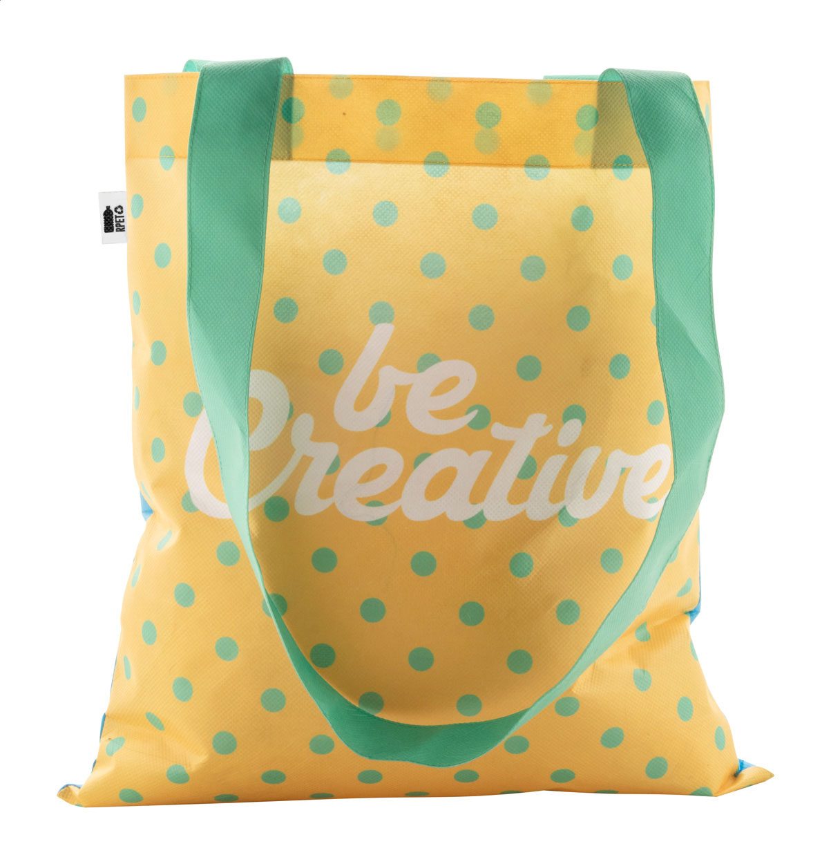 Custom made, RPET non-woven shopping bag with long handles, 80 g/m². With all over sublimation printed graphics and distinctive RPET label. MOQ: 25 pcs.