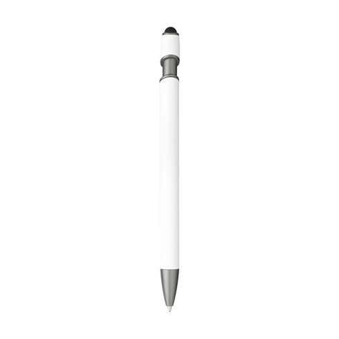 Blue ink ballpoint pen with a barrel made from recycled aluminium. The barrel has a rubberised soft-touch finish and a rubber top/pointer for use on touch screens. With metal clip. RCS-certified. Total recycled material: 94%. By using recycled aluminium, fewer new raw materials are used during the production of this product. This means less energy consumption and less use of water.