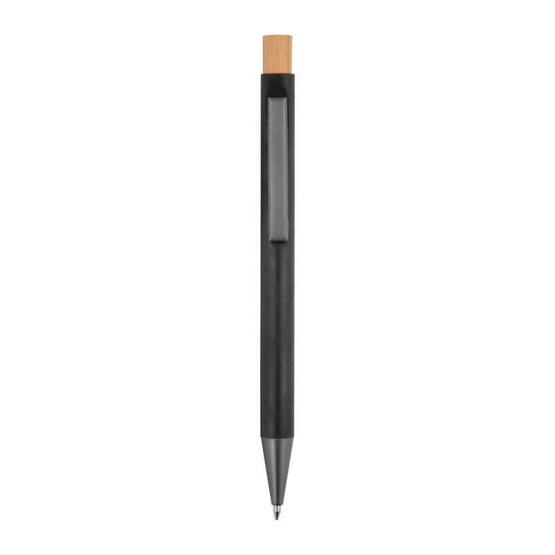 Recycled aluminium ball pen with bamboo pusher, metal clip and large capacity refill with blue ink. Your logo is engraved to the right of the clip.