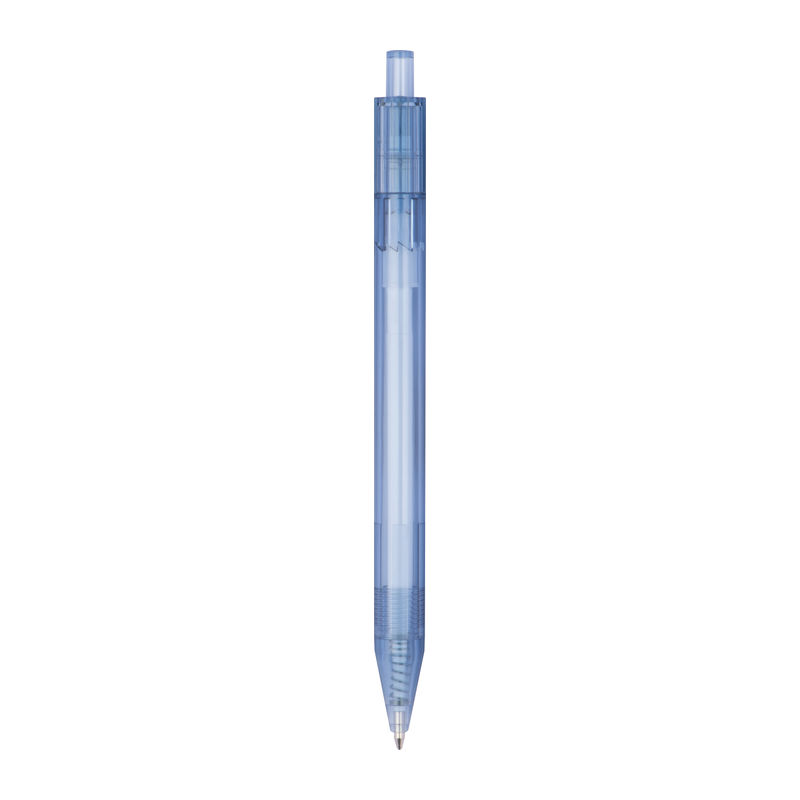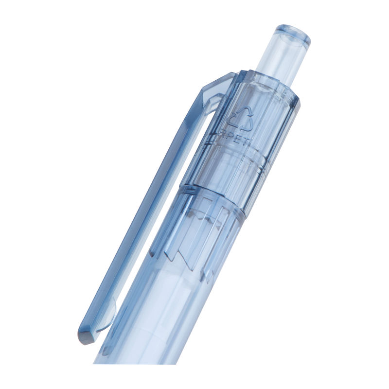 Transparent ballpoint pen made from recycled PET, featuring a large-capacity blue ink refill, a straight clip, a push-button mechanism, and an RPET logo.