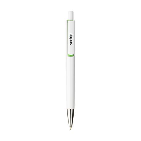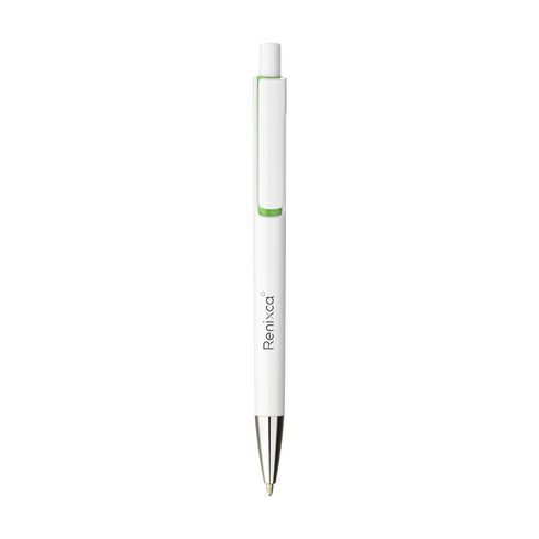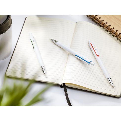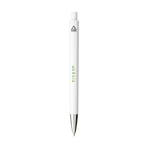 Blue ink ballpoint pen with a barrel made from 100% recycled ABS. With a unique design: the barrel and clip of this pen is designed in one piece. With colourful accent under the optical 'floating' clip. GRS-certified.