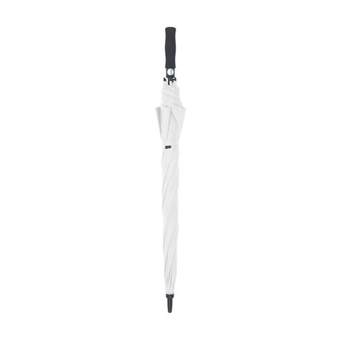 190T RPET pongee umbrella (made from recycled PET bottles) with an extra-large screen diameter of 132 cm. Features include automatic telescopic suspension for ease of opening, fiberglass frame and stem, soft foam handle, velcro closure and water repellent. RCS-certified. Total recycled material: 18%.