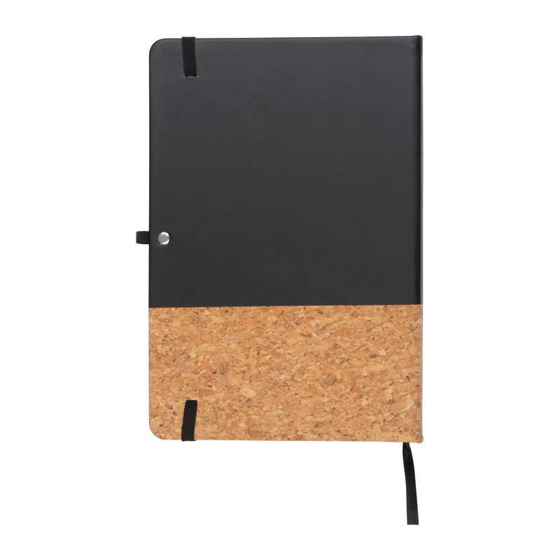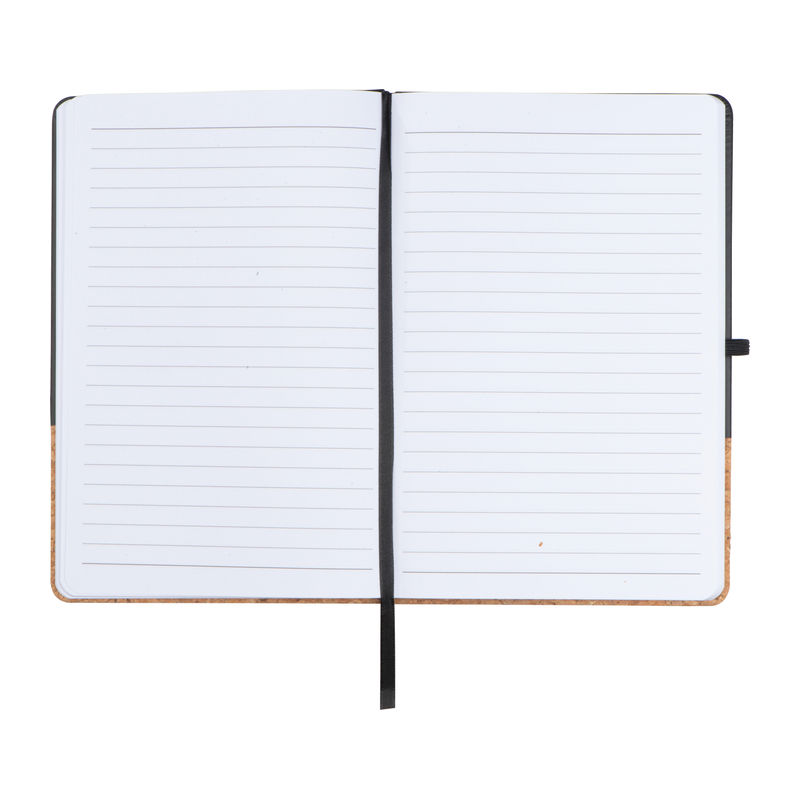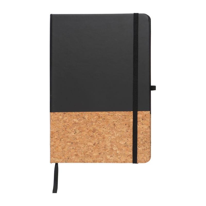 A5 notebook featuring 160 lined pages, a PU cork cover, bookmark, ballpoint pen loop, and elastic closure band.